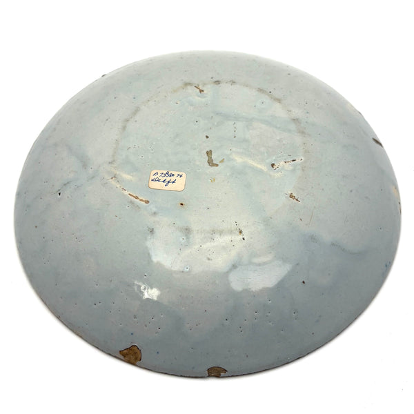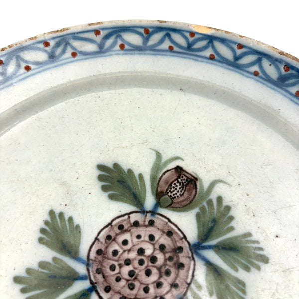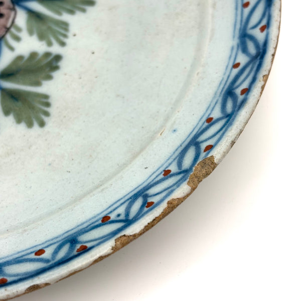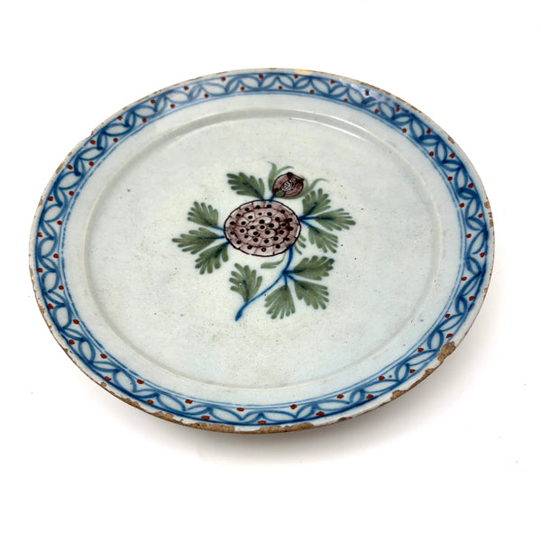 A hand-painted Delft plate, mid/2nd half 18th century, which, had I come across it in a museum vitrine filled with antique delftware and faience I would absolutely covet. With the flower and bud rendered in a similar manner to an 18th c. botanical drawing--like a plum colored honeycomb in this full frontal view, just waiting for the bees to arrive, and with the bud as if in cross-section view. Elegant and folky both, and very crisp feeling regardless of a few small chips around the rim.(Really, it feels like breathing fresh spring air.) I would hang this one on the wall straight away, very lovely.