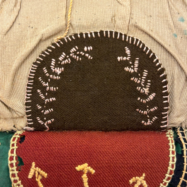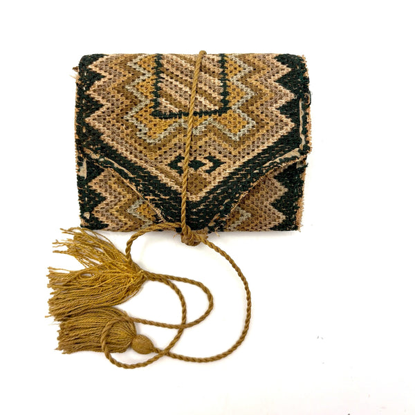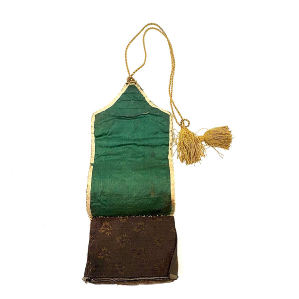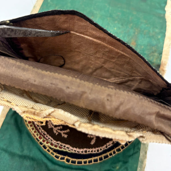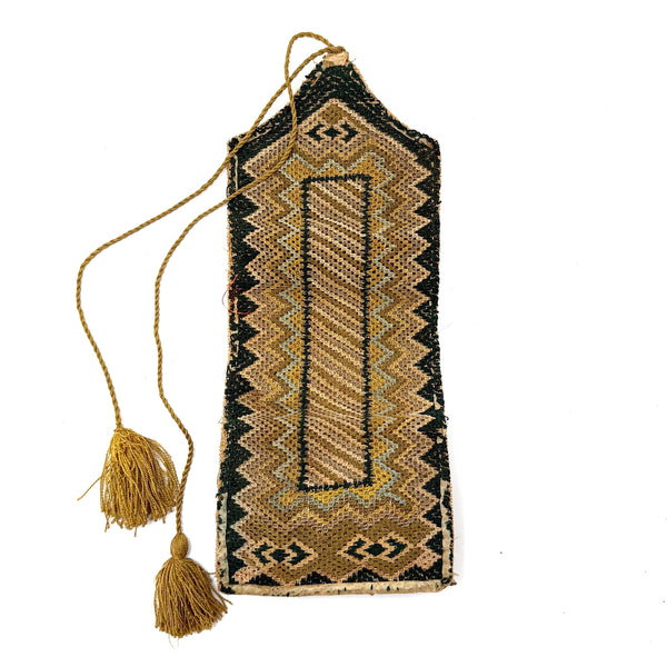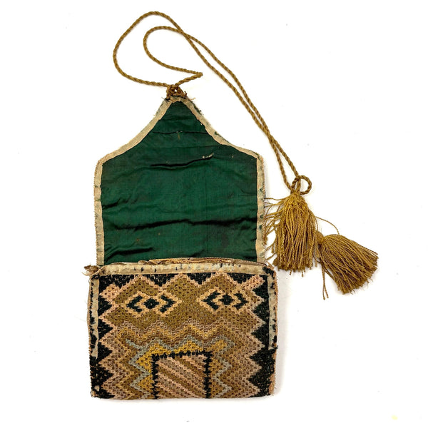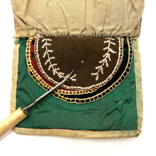 I believe this sewing pouch is Victorian, but certainly nods to earlier flame stitched versions. (I believe the zig zag needlework pattern would properly be referred to as "bargello," defined by flat stitches made with multiple laid in a mathematical, typically zig-zag pattern; the name originated from a series of chairs found in the Bargello palace in Florence with a "flame stitch" pattern.) The interior is lined with green silk and features a needlebook with wool "pages," each decoratively embroidered, as well as a rectangular brown silk pin cushion with pockets to either side. Very lovingly constructed, with ochre ties attached to the top flap point, ending in tassels.