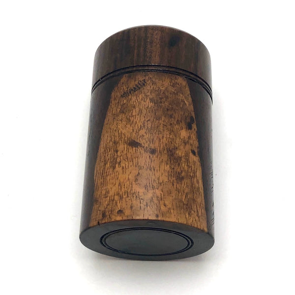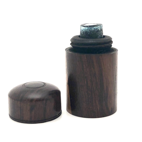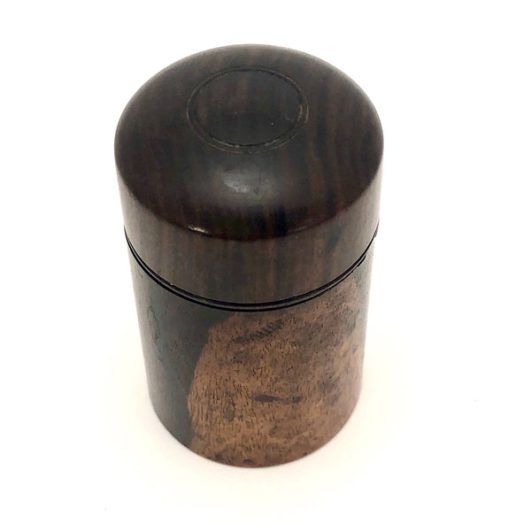 2 1/8" t x 1 5/16" d. Very good condition. Clearly used, with staining to the glass and interior of the lid, and a little staining to wood, which I have not touched. The threaded lid turns tightly closed and opens easily.