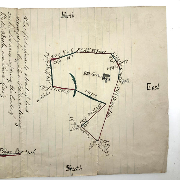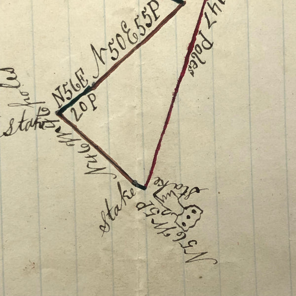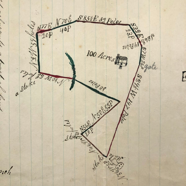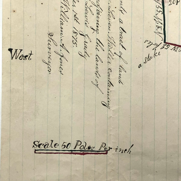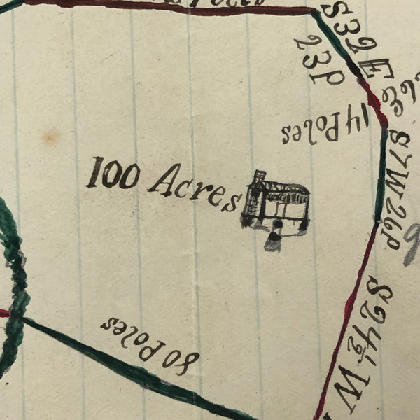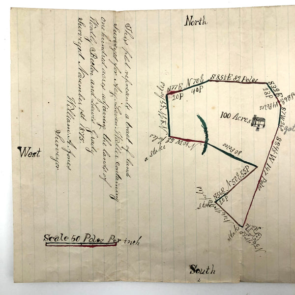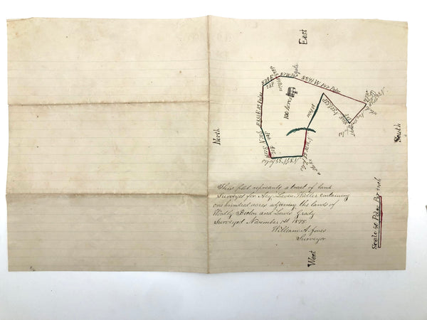 I always have an eye out for hand-drawn maps, but it is a rare and happy moment to find one as charming as this, with little ink drawing of a house, pointing hand, and a bit of watercolor embellishment too. One of three listed today by a surveyor William A. Jones in the late 19th century--this one showing a 100 acre plot surveyed in 1875 for an "Acy Leven Waller"as detailed at one end. Wonderfully done.