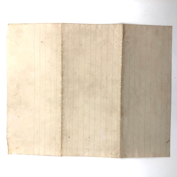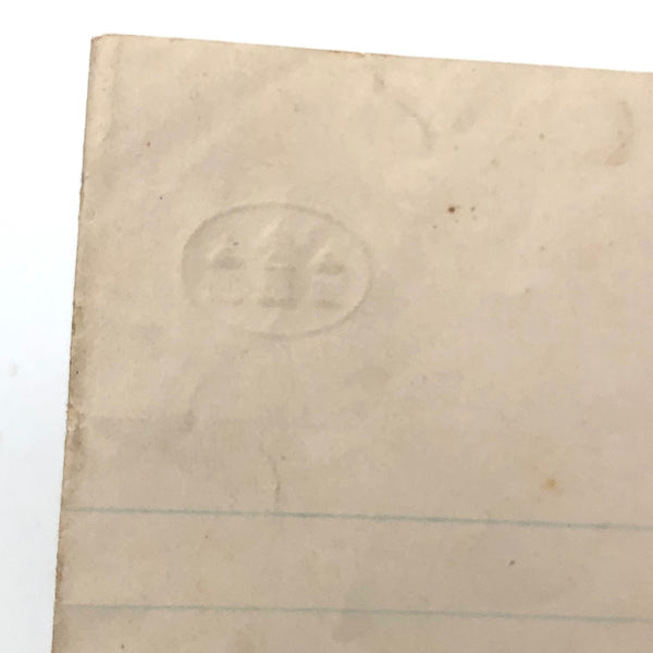 9 3/4" x 7 3/4" as shown in first photo, folded in half. Good condition, with old fold lines to the lined paper as evident, which shows an embossed mark at one corner.