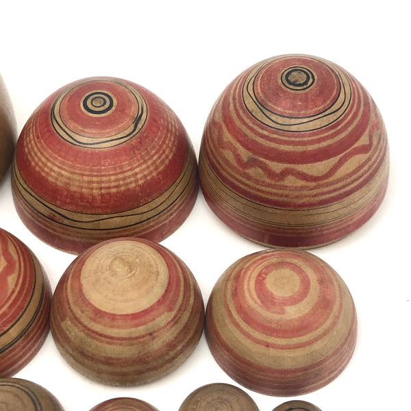The kin of these Japanese nesting eggs are the treen apples one sees around from time to time housing a spinning horse race game inside. These are a bit rarer from what I can tell, c. 1920s-40s I believe, with each of the eggs but for the largest one hand-decorated, I would guess while they were spinning around on a lathe. This set yields five complete eggs, which hold together snugly, and then there are four more unmatched halves that fit neatly inside but don't have the other halves to complete them.