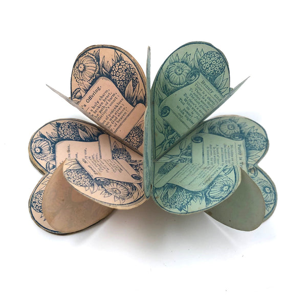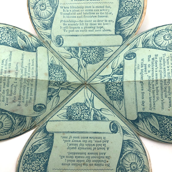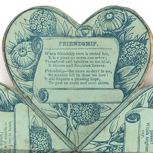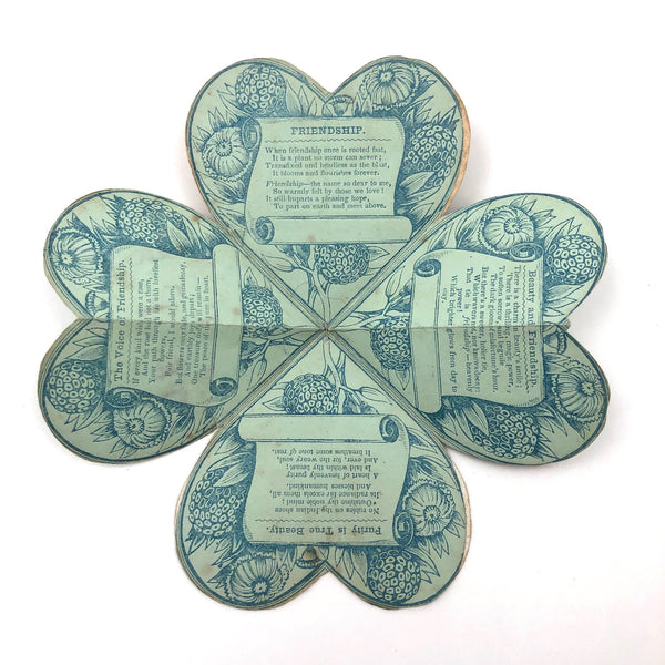 A lovely and rare little thing, delivering layers of happy surprises. "Puzzle purse" type valentines were first made in the 18th century by hand (oh how nice to find one of those) but by the 1840s or so printing advances allowed for the creation of ones like this--which bear a close resemblance to rewards of merit from the same period. There are three layers here inside the hand-colored heart-shaped covers, folding out as four-leaf clovers, with poems printed on each leaf. With a stitch of thread at the point of the heart holding it together, though a bit loosely; I'm thinking to add one fine stitch through the same tiny hole to shore it up before shipping, carefully I promise.