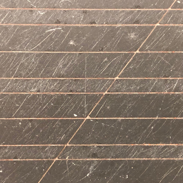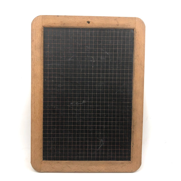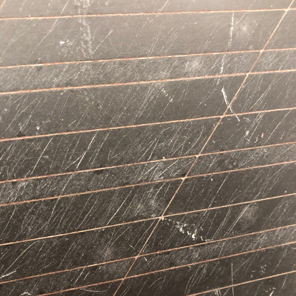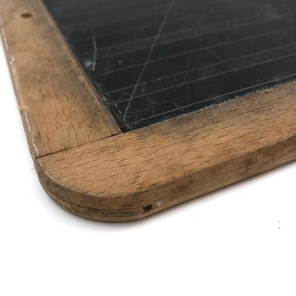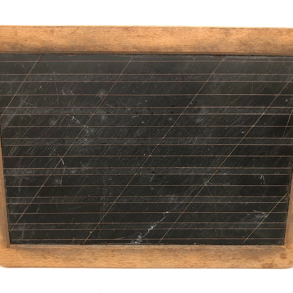 I've bought and sold a lot of old school slates, usually attracted by the often mended (and best of all carved into) frames on very antique ones. In this case, though, it is the slate itself that sold me, one side etched with a grid, as one sometimes sees, but more unusually the other with angled guide lines of varying widths, designed for practicing cursive writing at just the right slant I believe, both in capitals and lower case. And that side especially on this slate was much used, with the traces of lots of letters lightly scratched across its surface horizontally.