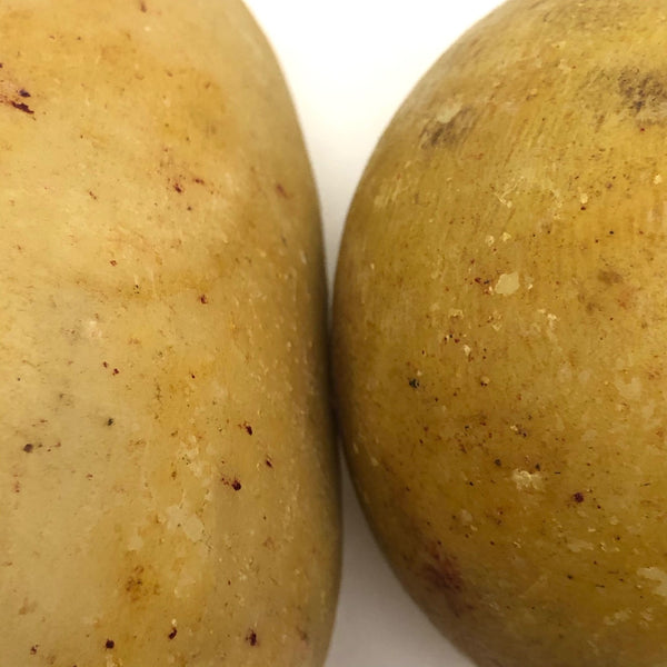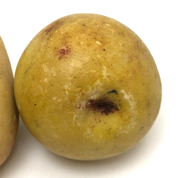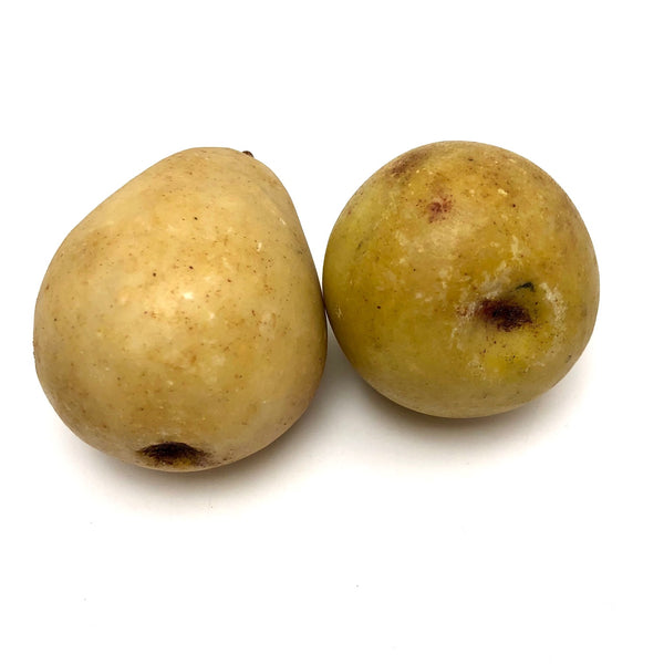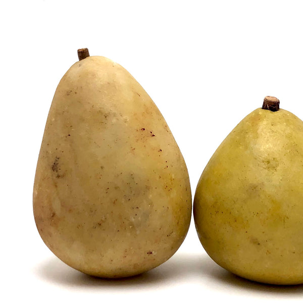 Since finding an exquisitely bruised-looking old stone fruit peach, I've been on the hunt, with a very particular eye to what I'm looking for. This pair of pears--looking like maybe a Bartlett and and Anjou--completely fits the bill! Beautiful form, great color, very pear-like bruising, nice wooden stems--they look positively ready to slice up and put on the cheese board. I do believe old stone (marble) fruit, like clay marbles and bone domino, have officially become an obsession.