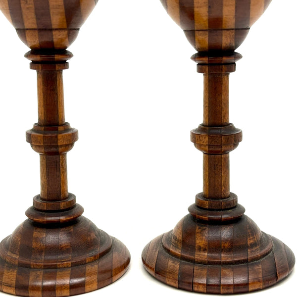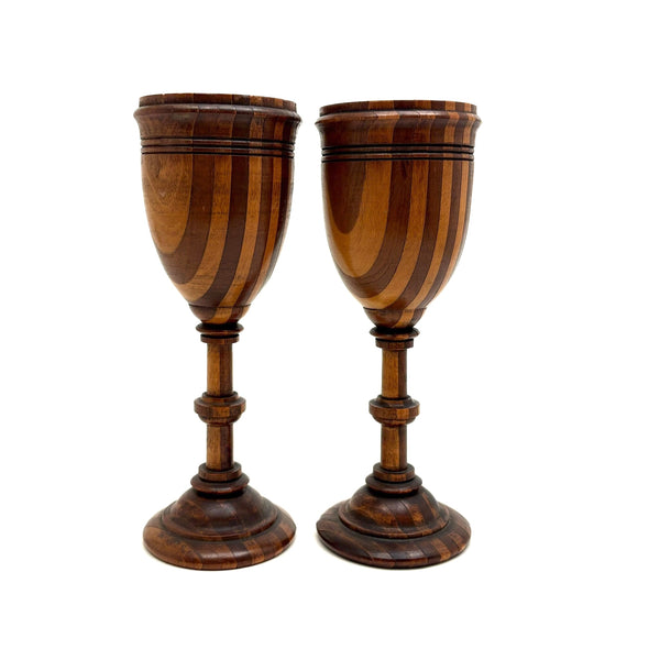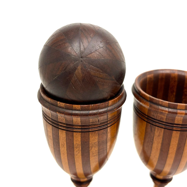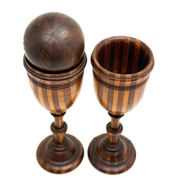 Goblets each 6 1/8" t; 2 1/8" d at tip. Ball approx 1 7/8" d. All 19th century I believe, and all in very good condition, with just a hair of what I quess would be called uneveness due to the shrinkage on the foot of one goblet--i.e. a couple of stripes of wood are just slightly raised--no real matter at all.