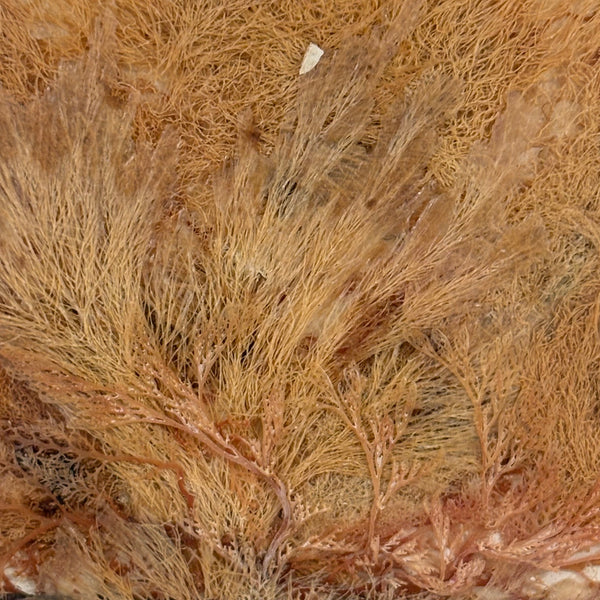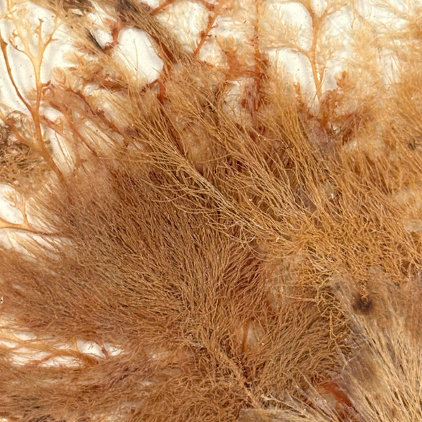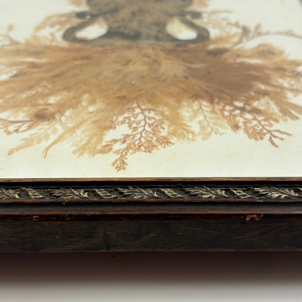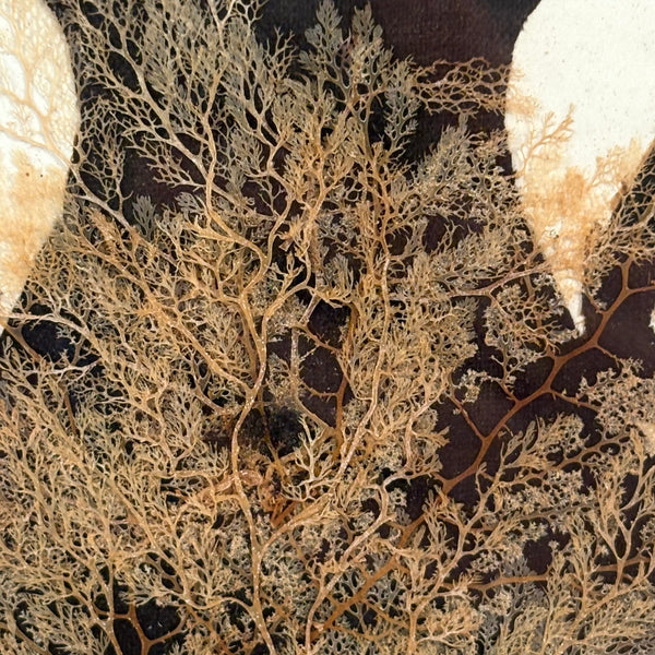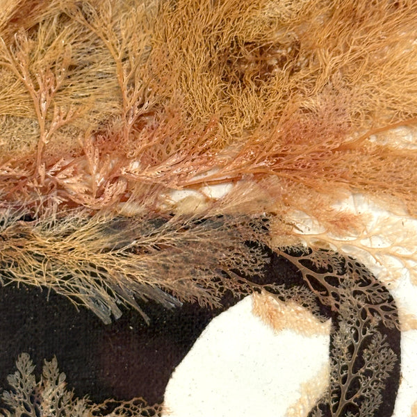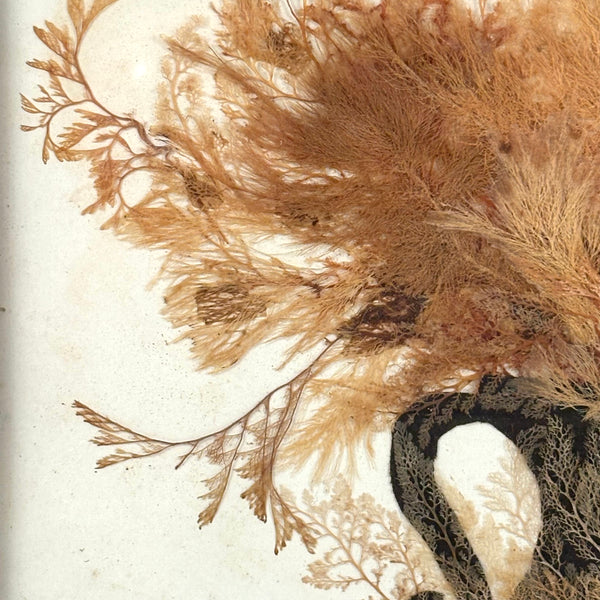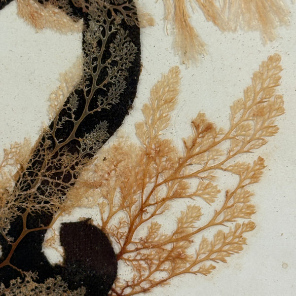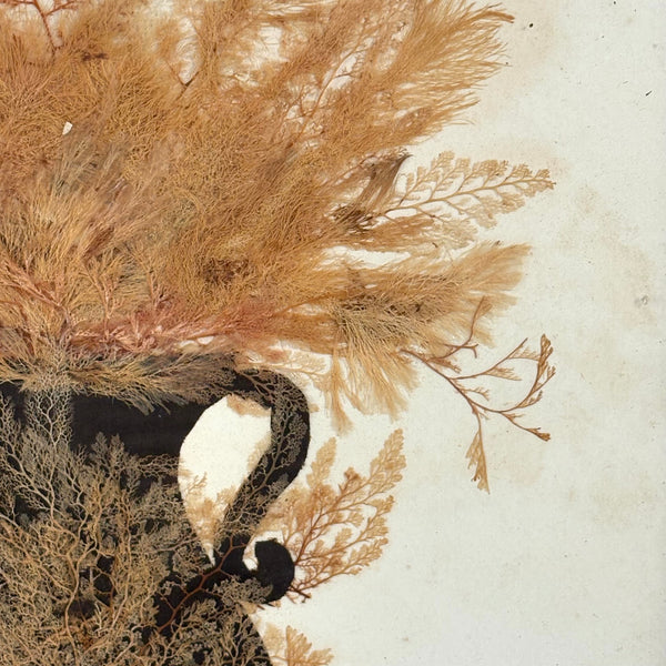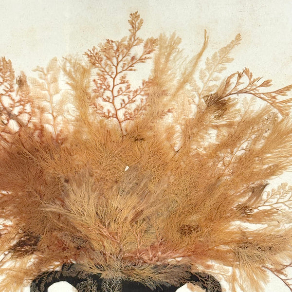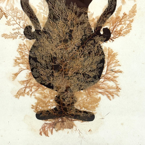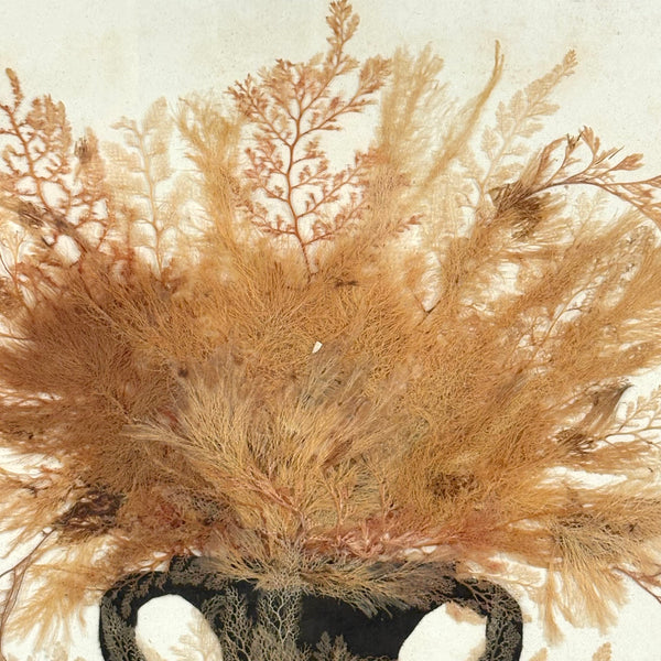 Occasionally I'll see a Victorian dried flower composition with a cut paper element, but I don't believe I've ever seen a sea moss picture like this before, with that black paper urn evoking a theorem painting stencil as well as a cut paper silhouette portrait, and I think locating it c. 1850s or so. I love sea moss pressings of all sorts (including for the fact that sea moss gathering represented an acceptable way for young women to get out in nature on their own!), and especially whole "pictures" like this--and with a satisfying density and wildness to the moss here, feeling almost like flames!