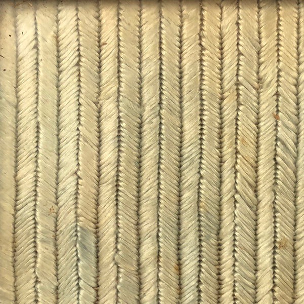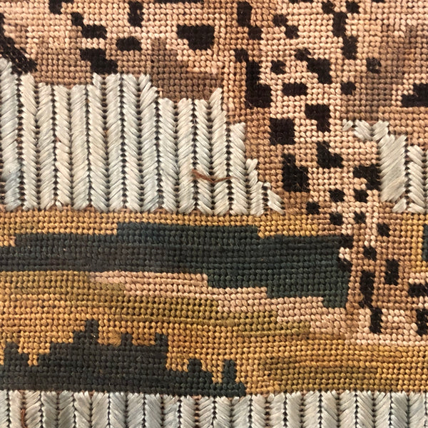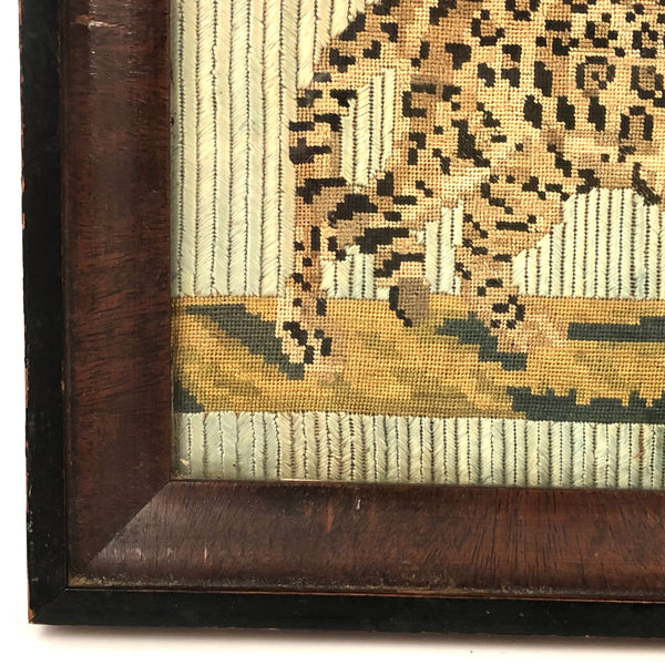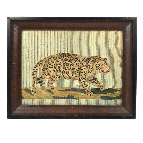 I've done some looking around, but can't find another needlework quite like this one, executed in what appears to be silk thread, with wonderful herringbone pattern to the pale green ground and very fine (petit point) needlepoint for the leopard and stripe of green and gold earth below him. I believe European, and I believe quite old--it has the feeling of French tapestries to me. Perhaps made as the face of a pillow in a palace, I'm not certain, but quite fine, and very striking, and how not to love an elegantly stalking big cat?!