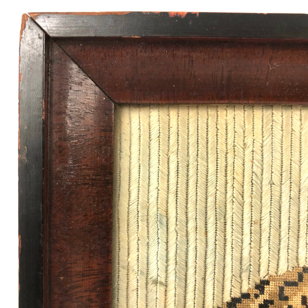 Framed as found: 10 5/8" x 8 3/8". Sight: 8 1/2" x 6 1/4". Very good condition, no lost stitches at all that I see, just a bit of minor staining/toning to the green ground toward the right edge, pretty minor.
