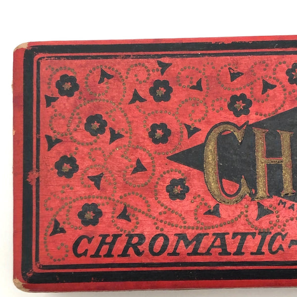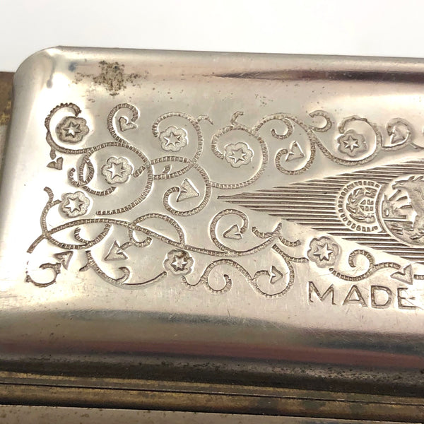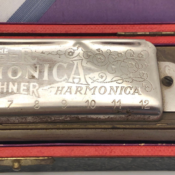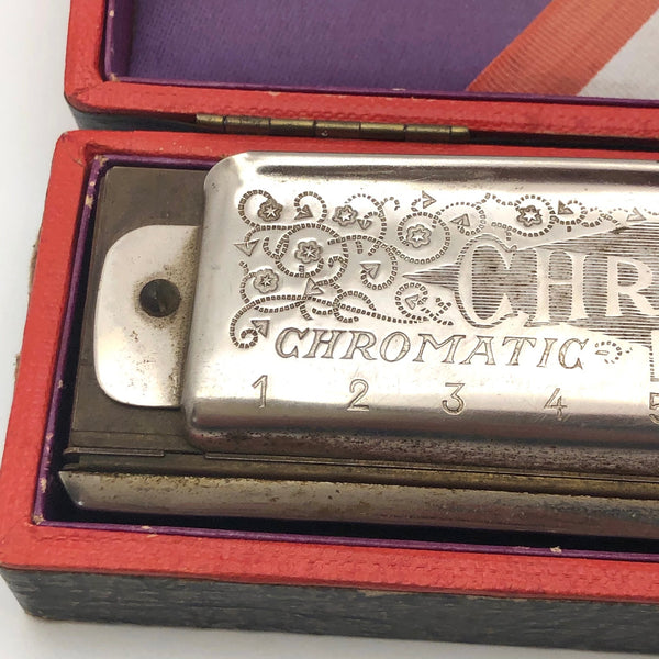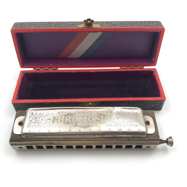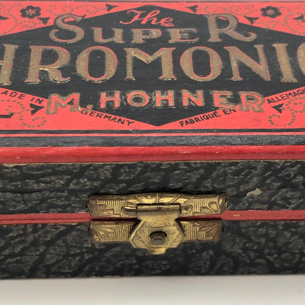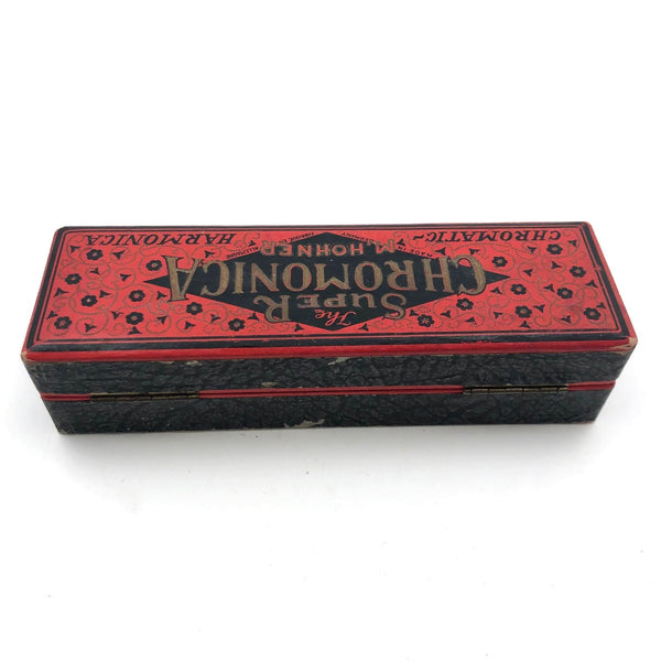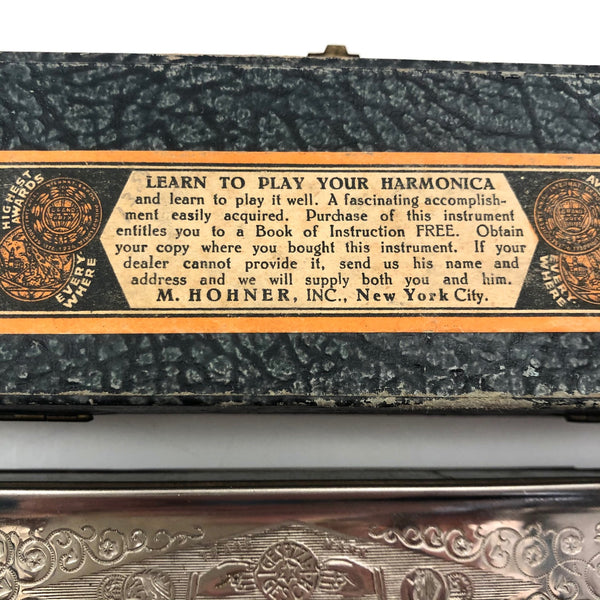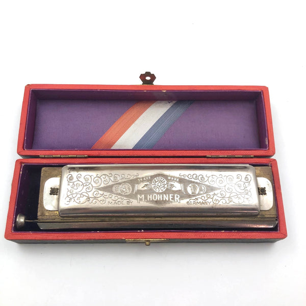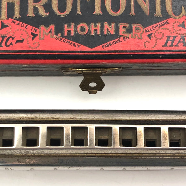 I believe this dates to the 1920s or so and is a pretty classic one, which Hohner continues to produce in a very similar design. The box is in near perfect condition. There is one dent toward the right side of the top cover plate and one fine hairline crack to the surface of the wood on the back of the wooden comb, as pictured, very minor. Otherwise, very good condition. Box measures 6 5/8" l x 2 " w x 1 1/2" t. Harmonica measures 5 9/8" l (not including sliding extension.)