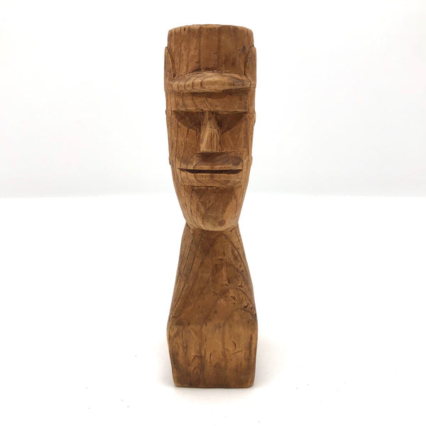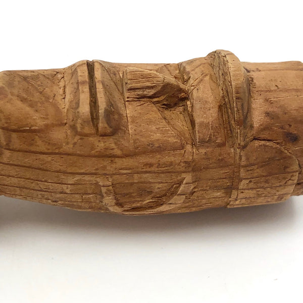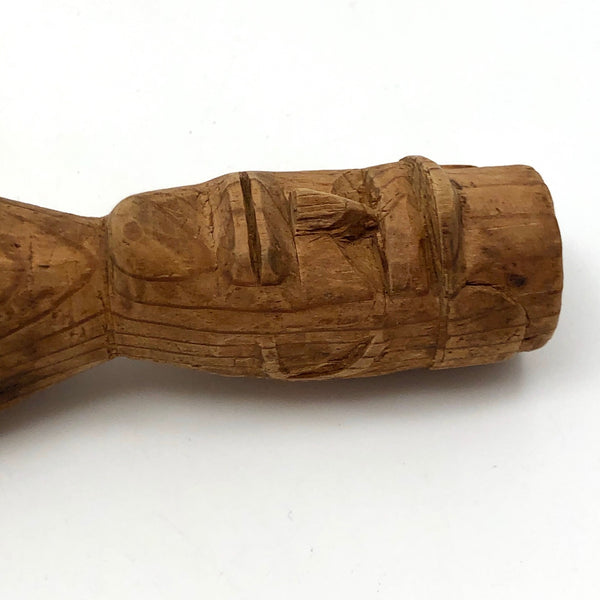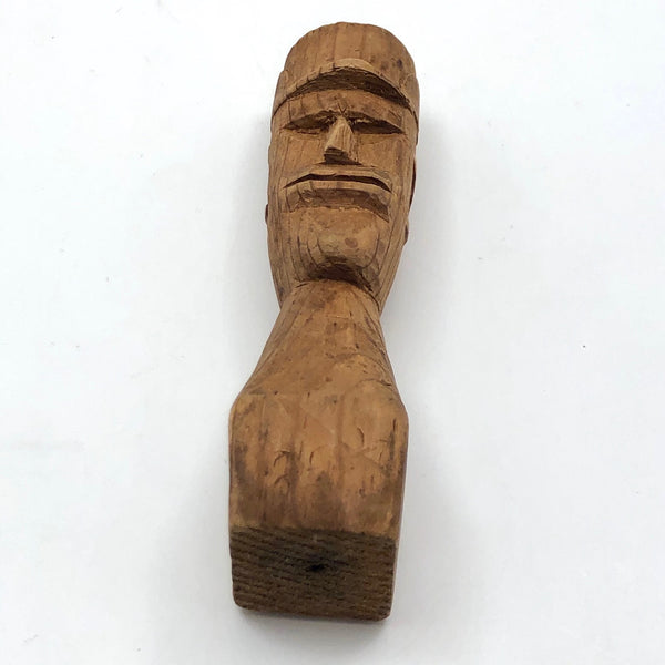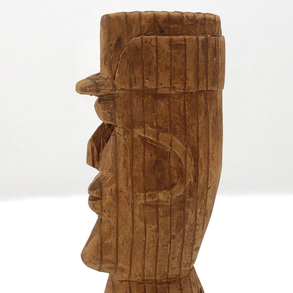 I can't decide for sure whether that hat on this guy is a hunting cap with the ear flaps up, or an engineers cap? I could easily see him at the helm of a train, periodically sounding the whistle, but could also imagine him out in the woods, with his over-sized ears well suited for picking up the sound of birds and rusting animals in the distance! Either way, a sweet, fairly old carving, and nice addition to any carved cast of characters.