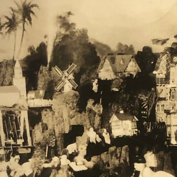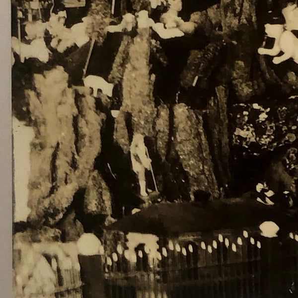 Perhaps a fun project for a researcher to try to identify the man in this photo, standing beside what is surely his fantasyland creation, and looking as if about to place a large house (by the scale standard of the rest of it) somewhere within it! With palm trees on the horizon, angels flying, figures--and animals--nestled into the cliff side, and all manner of architectural structures, from church, to playground, to cottages and grand villas, and with what looks to be an illuminated promenade down along the shore. Pretty fabulous!