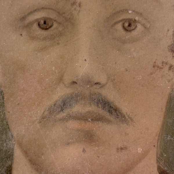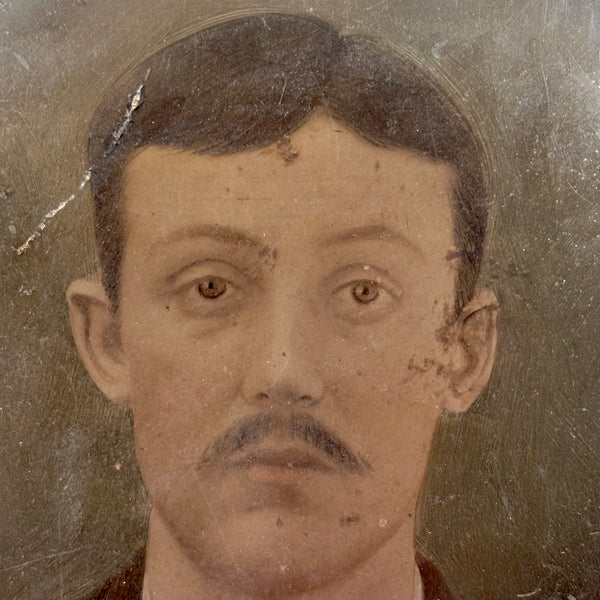 Unusual to find a hand-painted full plate folk art tintype like this mounted to wood--certainly done later, and with a shoe string threaded through two holes in the wood to hang it, a nice make-do sort of detail. I really love his face, and delicately painted mustache and striped tie, and his Mona Lisa-esque sort mystery-intensity, with an eyes following you around the room aspect for sure. Feels very present, an excellent one to live with.