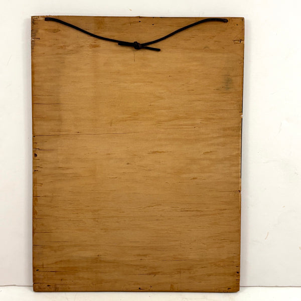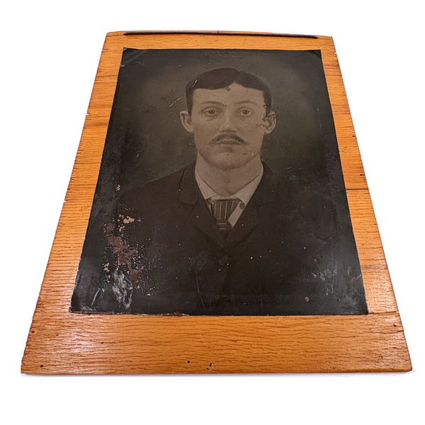10 7/8" x 8 1/4" as mounted to wood panel, with a shoelace threaded across the top for hanging. Full plate tintype itself 8 5/8" x 6 13/16". Some surface scratches and erosion to the surface of the tintype particularly lower left corner.