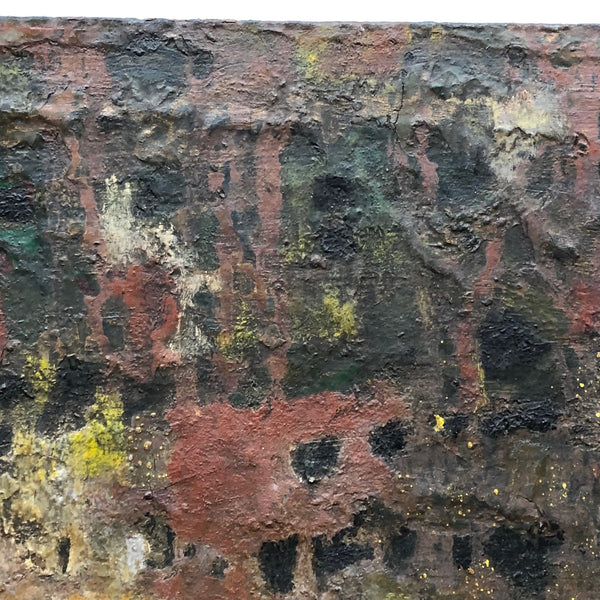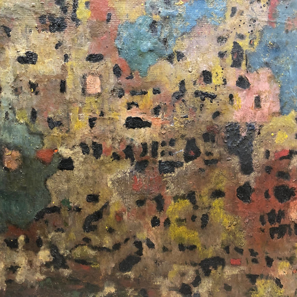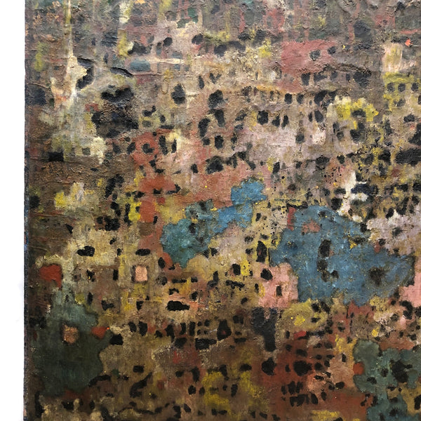 24" x 22", oil on masonite, good condition, uncleaned (whatever grime from the years has become part of the surface and feels all of a whole with it, I think in a good way. ) Shot in crummy lighting, that makes the bottom third appear darker than the rest of the painting, which is not the case. Much better in person.