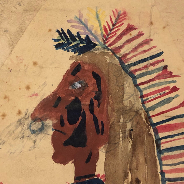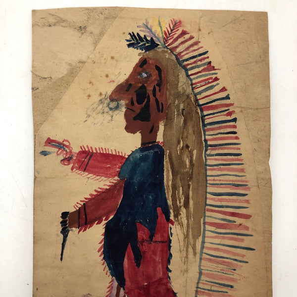 I purchased this and a second naive watercolor drawing, surely by the same maker, from a seller in Pennsylvania, who found them tucked in the back of a late 19th century scrapbook. With gun in one hand, dagger in the other, this incredible feathered headdress, painted face, and streaming hair, I find it incredibly expressive and potent, in a manner not unlike ledger drawings, though I am pretty sure this is not a Native American piece.