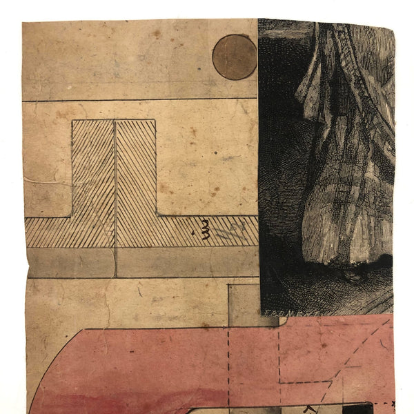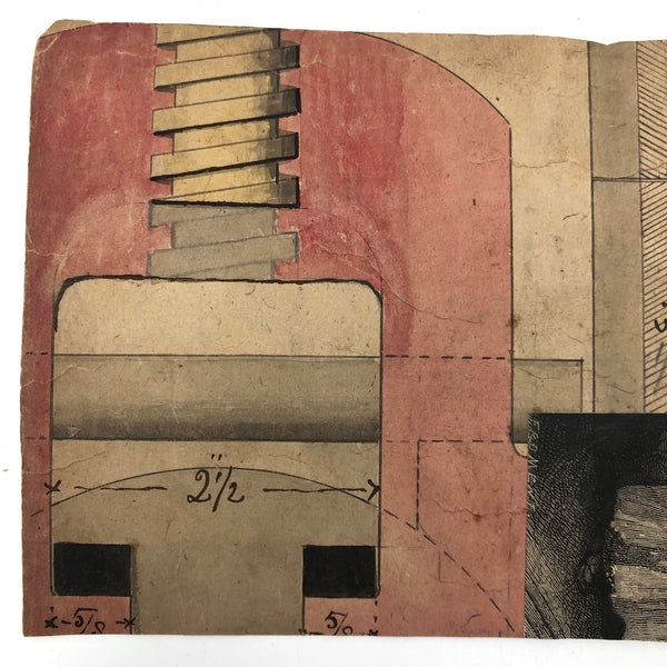 Executed in super saturated color on natural colored heavyweight paper. It appears that the painting was cutout and glued onto a backing, which features what appears to be a hand-drawn and watercolored rendering for something industrial, with a bit of collage on top. 7 1/2" x 4 11/16". The paper shows wear, some roughness, and a few toning spots, which I think just add to the effect.