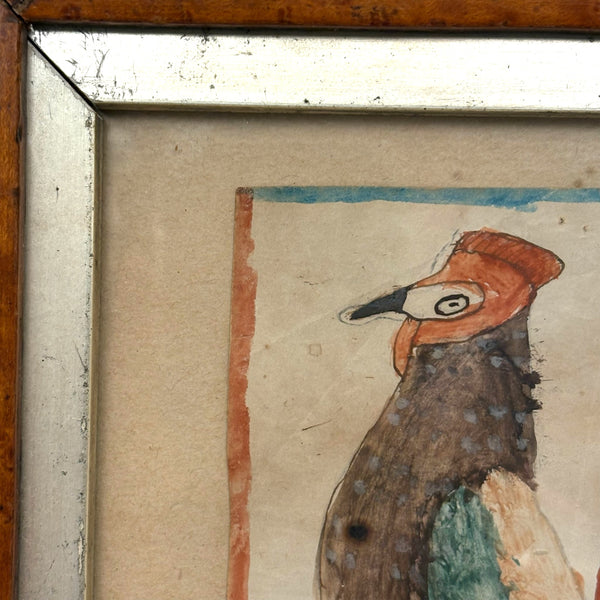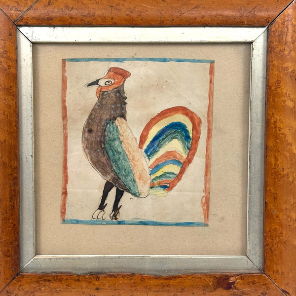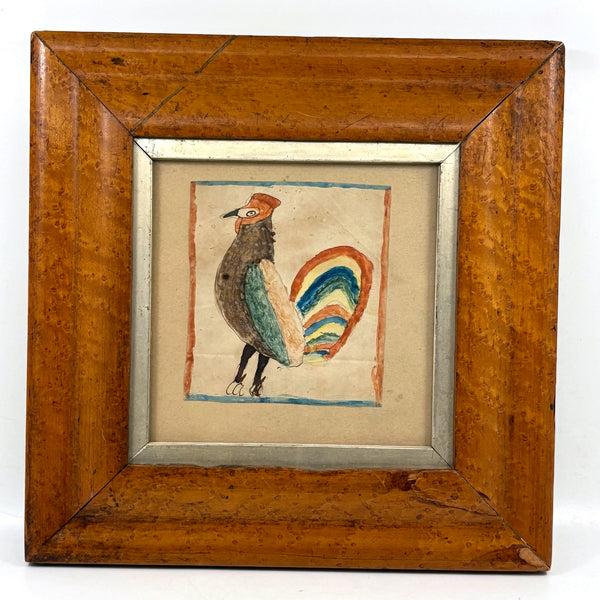 Marvelous Early 19th Century Folk Art Rooster, Ink and Watercolor, in Period Birds Eye Maple Frame