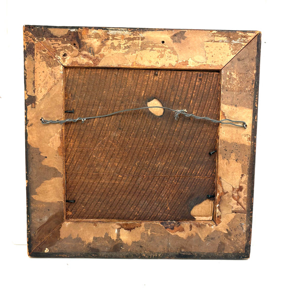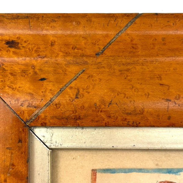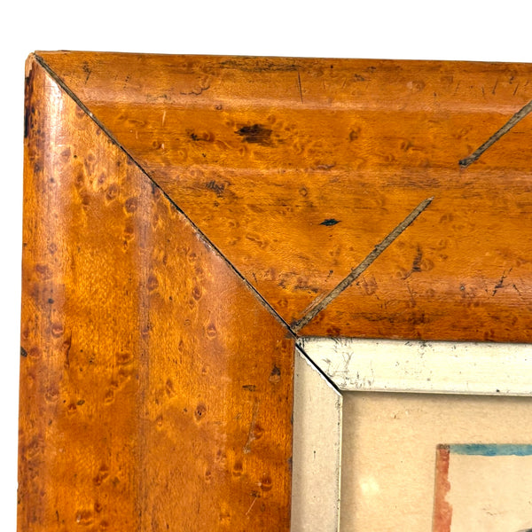 12" x 12 1/8" framed, under glass, in beautiful birds eye maple frame--period if not original to it. Sight 6 3/8" x 6 1/2".Beautiful condition, rich color (even better in hand). One minor, very old surface flaw to the wood on the frame (a straight, thin diagonal line top right)--I don't think detracting. Great old wood backing and wired for hanging.