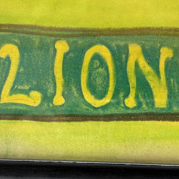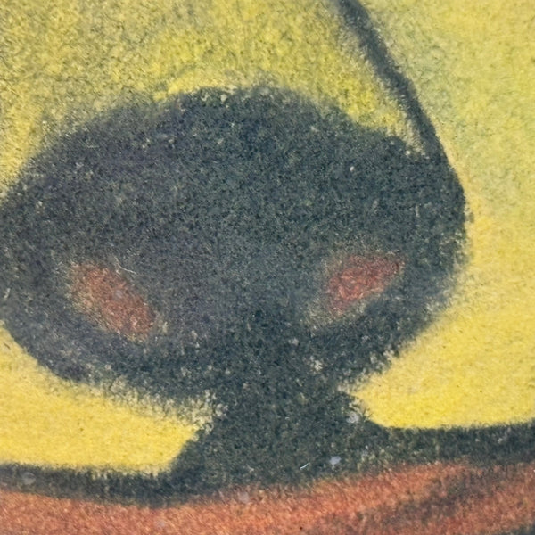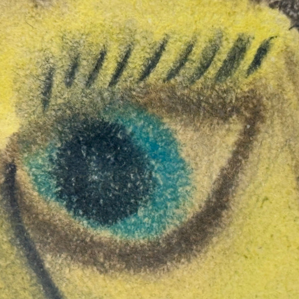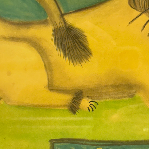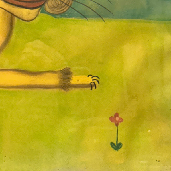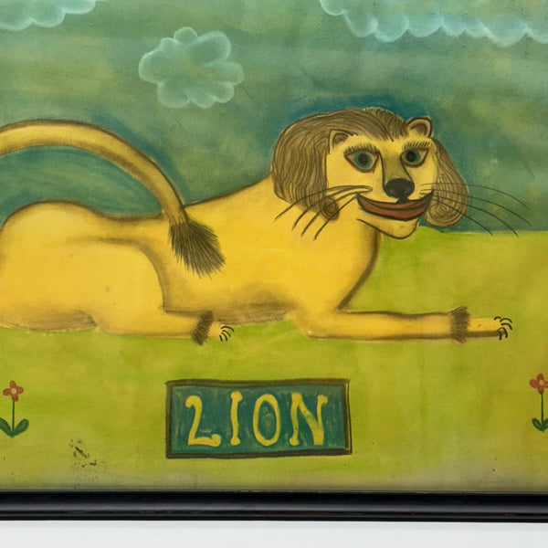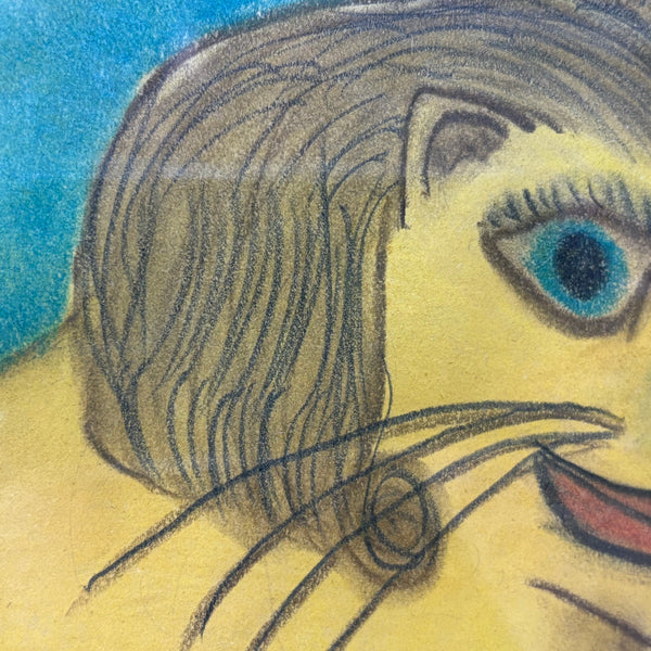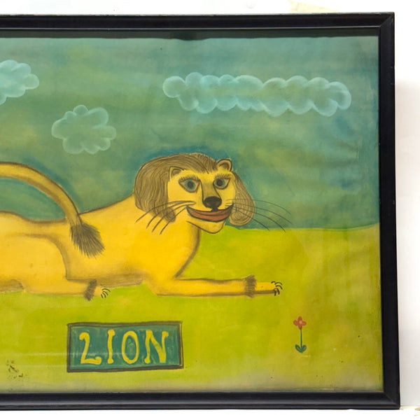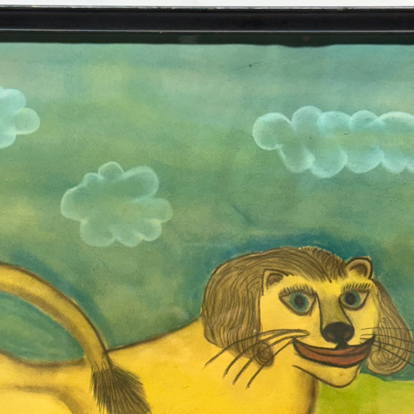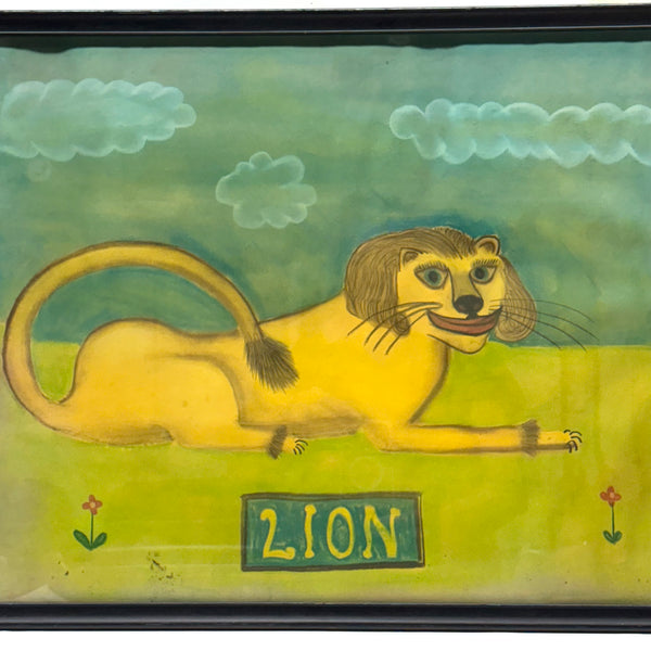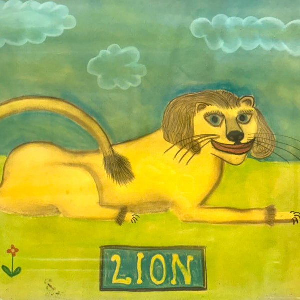 I wish I knew everything about this one but I don't. I know it lived in a New England collection for many years, the same collection as the 1817 Lady Justice watercolor listed today; I purchased both from relatives, and know this lion was the owner's favorite. No wonder! It feels to me more more like a work of a self-taught artist than a child, and a bit more "outsider" than "folk"--a visionary version of a lion, though very much in conversation with a whole history of folk art lions too. In any case, what eyes, and what lips, and what hair! (A bit of the Carol Channing of lions.) And what electric color. With very excellent treatment of the hair on the tail and cuffing the paws too. And then these two single flowers to either side and puffy clods overhead. Pastel, with a bit of a sandpaper-y texture to the surface it looks to me. Transcendently good!