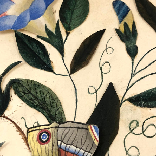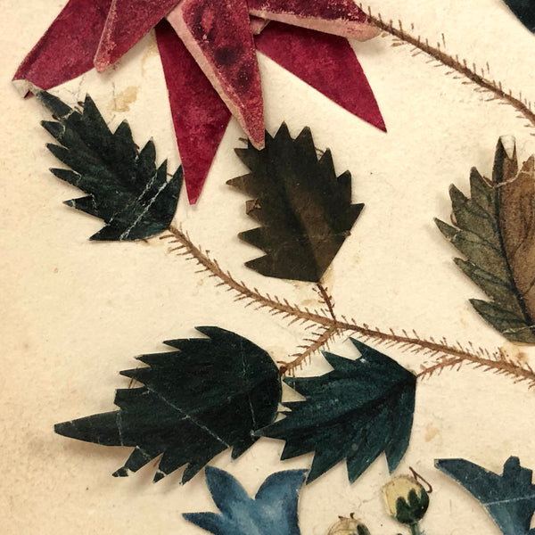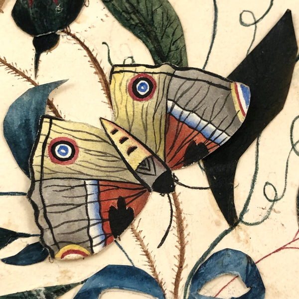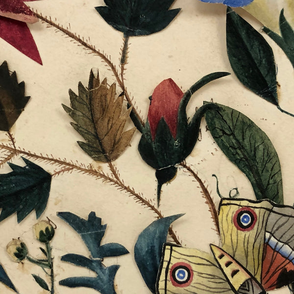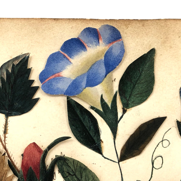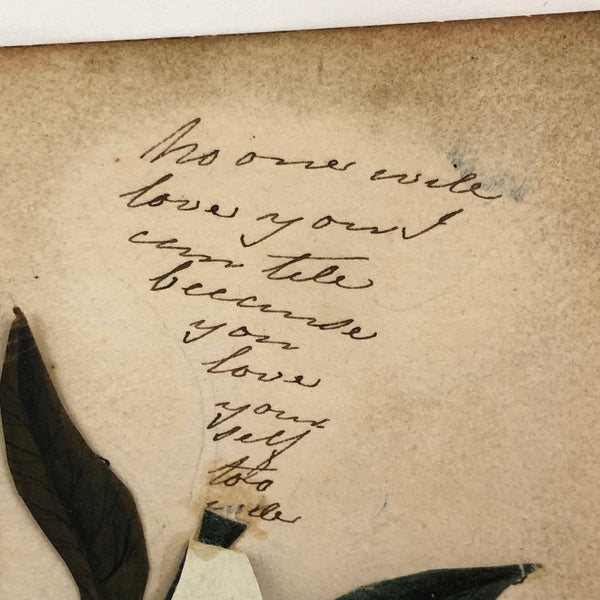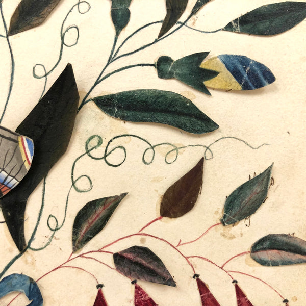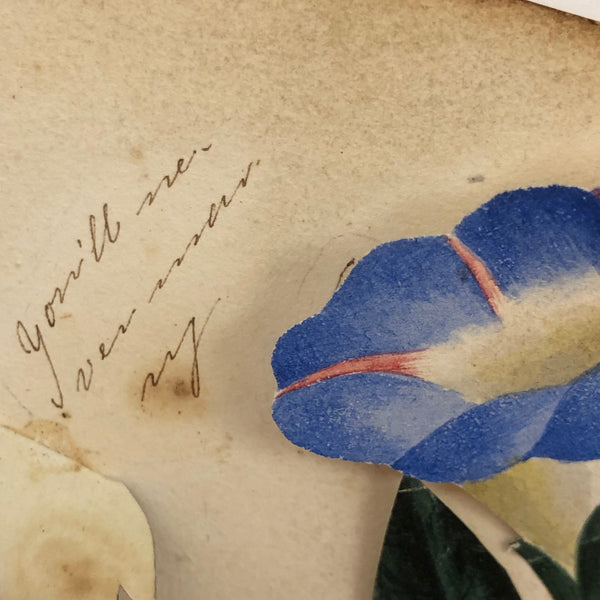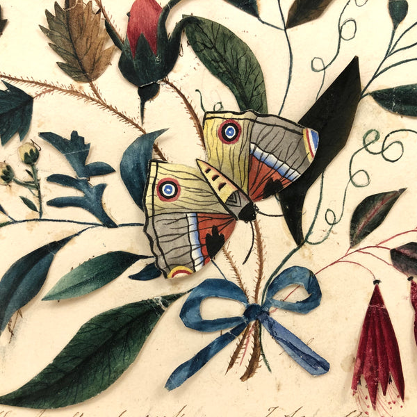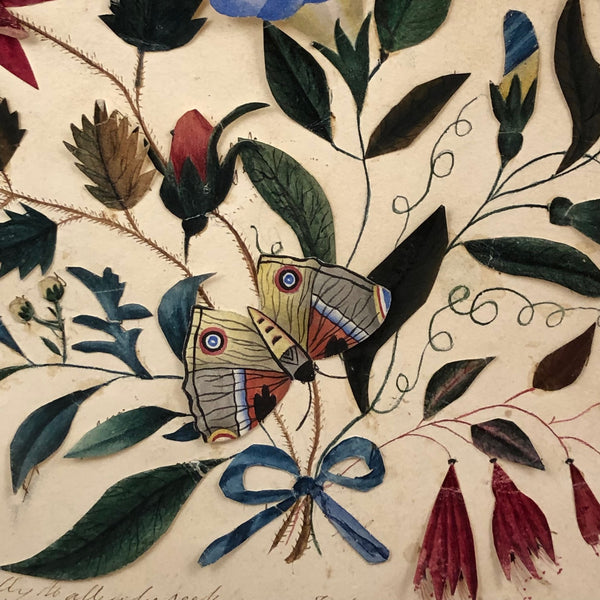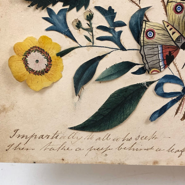 A rare and special thing this one, a fortune telling valentine of sorts, which I purchased from a great paper dealer in Pennsylvania, who had kept it in his personal collection for some years. A gorgeous watercolor taken at face value, but under most every leaf and bloom is a hidden message, revealed when one flips that bit up (and so a pretty intricate work of cut paper, too.) I especially love the fact that many of those messages are the opposite of saccharine, bluntly delivering harsh sentiments or diagnoses: "deposed to jealousy," "I would not be you, you are too much of a shrew," "no one will love you I can tell because you love yourself too well" - ouch! And with an apt description (warning!) along the bottom: "Impartially to all who seek, then take a peak behind a leaf...I faults and fortunes show if you your own would know." Pretty amazing, and marvelously executed. And with a fancy paper purse bloom at upper left, which I have not opened for fear of not being able to close it properly, but which I'd guess may contain a bevy of fortunes inside!