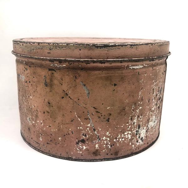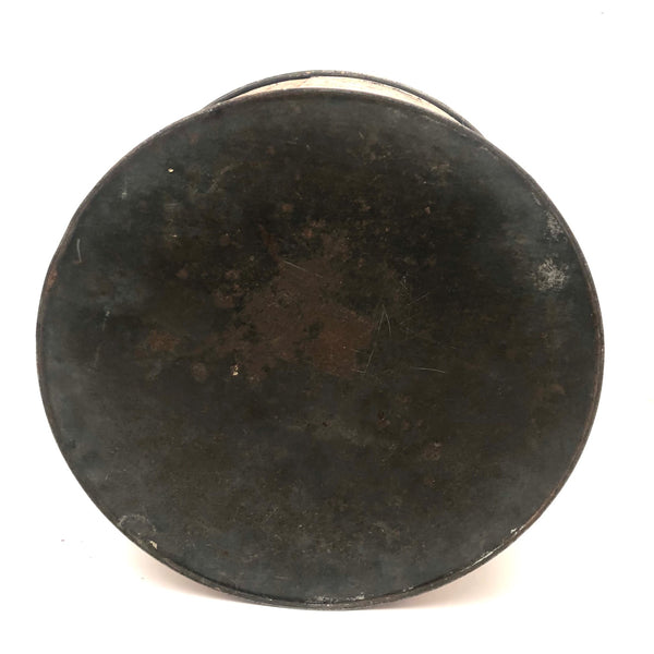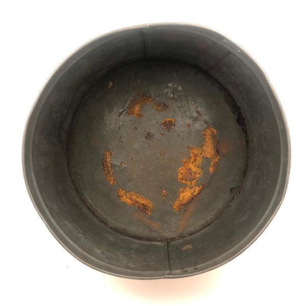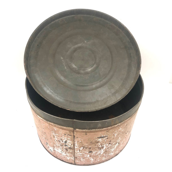 10" diameter x 6" t. Plenty of scuffs and stains and paint loss here and there, all to the very good in my opinion. Lid fits tight.