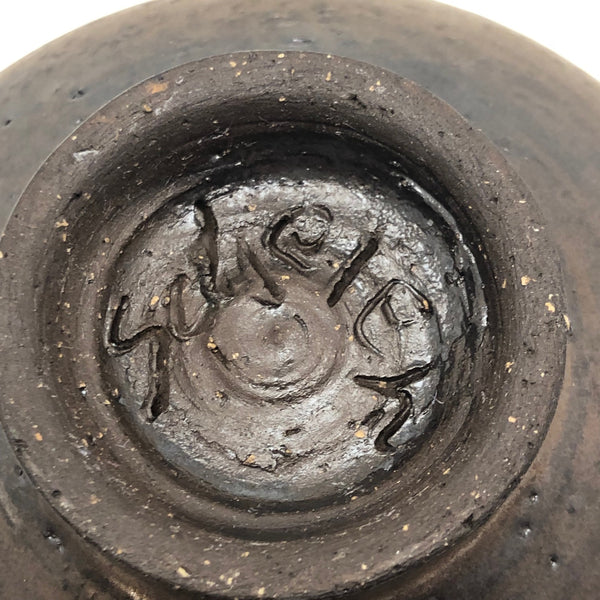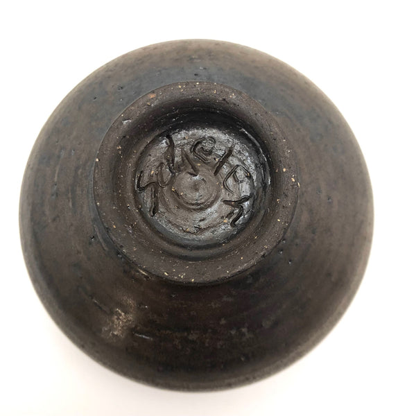 3 13/16" in diameter x 3 1/16" tall. Signed (incised) on the base. My photos don't quite capture the reactive copper glaze, but it has a metallic sheen. Without a flaw whatsoever that I can see. Last photo is with 1940s Scheier mug, listed separately.