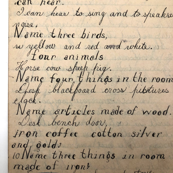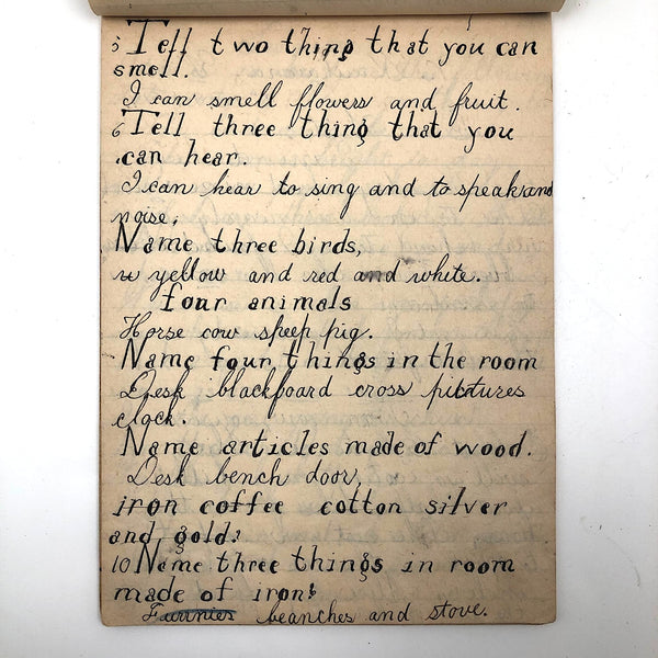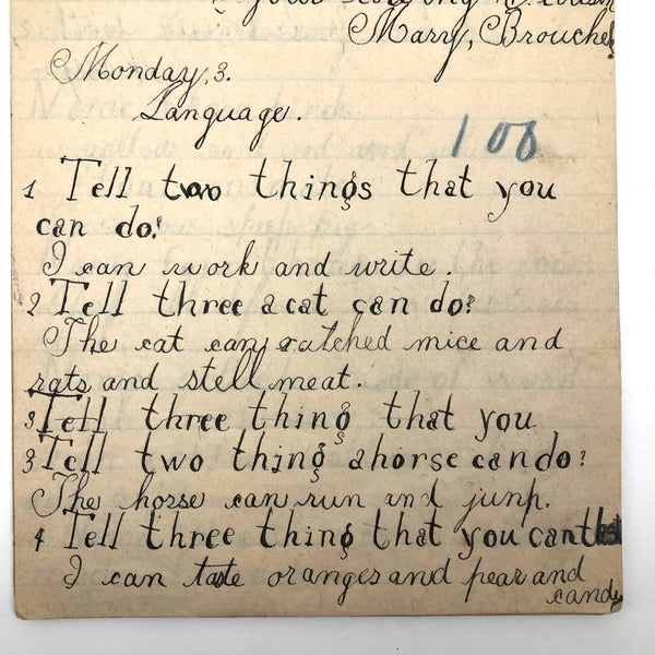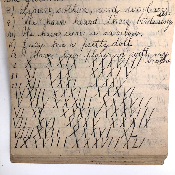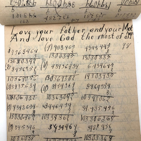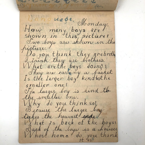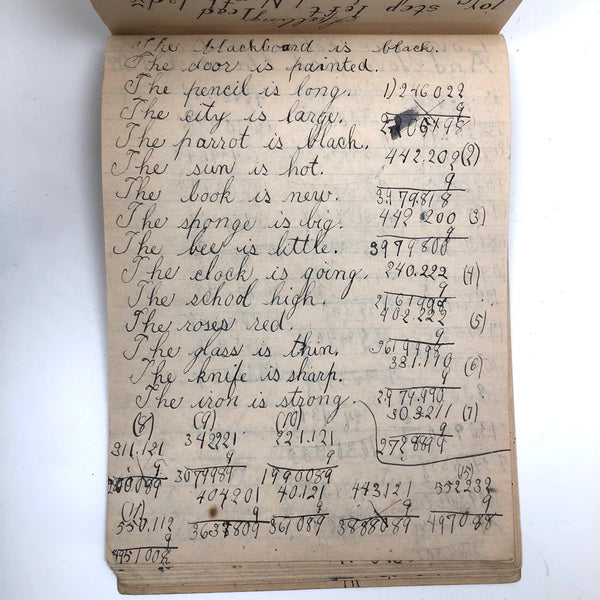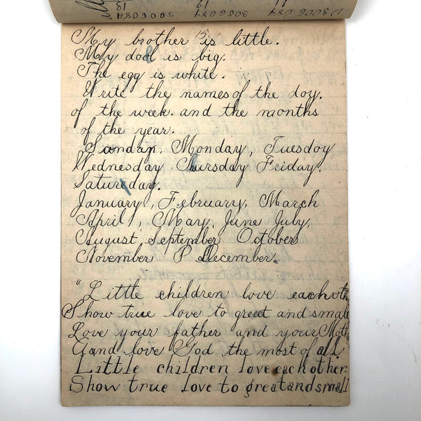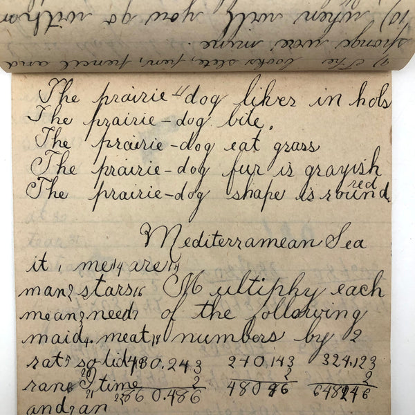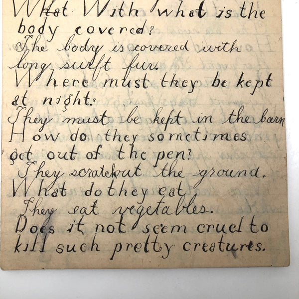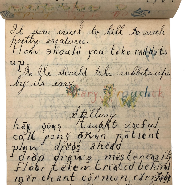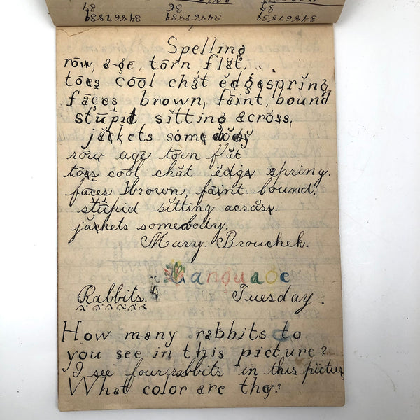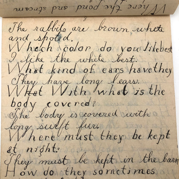 When I come across a school notebook as sweet as this one, completely filled by a young Mary Broucher years and years ago, I simply have no choice but to become its steward. An excellent sort of call and response between questions, written in the best printed lettering, and then answers written in careful cursive--lots of them happily addressing the qualities and habits of a rabbit: from a bunny's "surft" fur to the proper way to pick one up (by the ears) to the conclusion: "it seems cruel to kill such pretty creatures." With great phrases cropping up throughout-- "Little children love each other. Show true love to great and small"; math calculations interspersed with language lessons, and little flowers and flourishes drawn in colored pencil here and there. Dense with joys, and formally the handwriting, particularly the printed lettering of the questions, completely does it for me.
