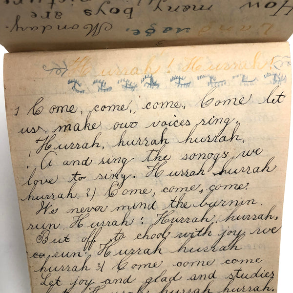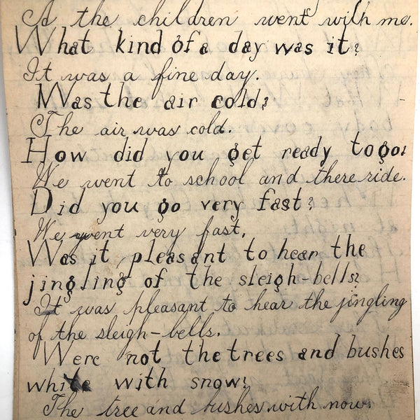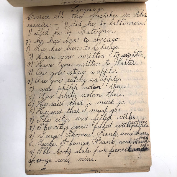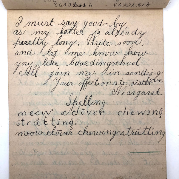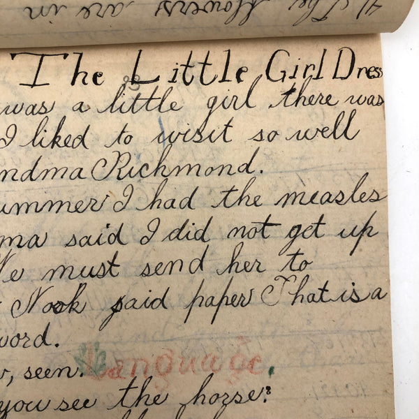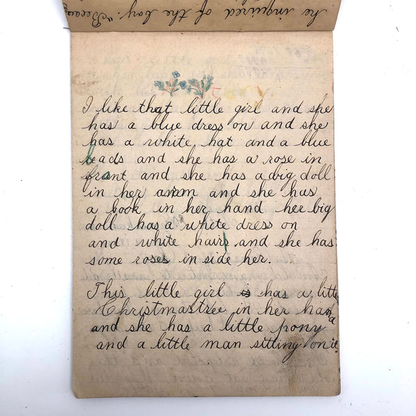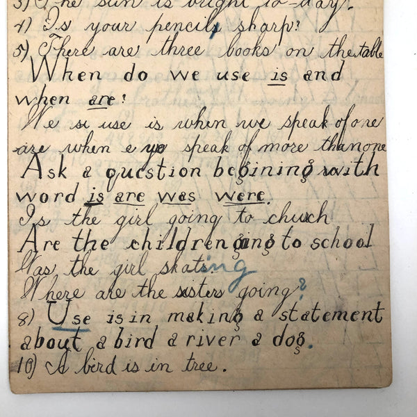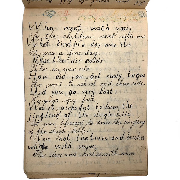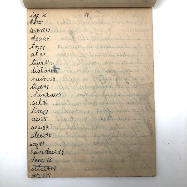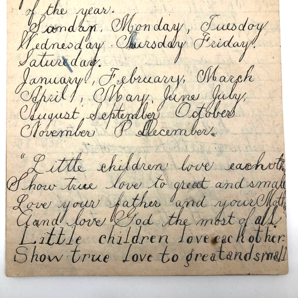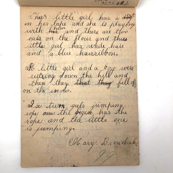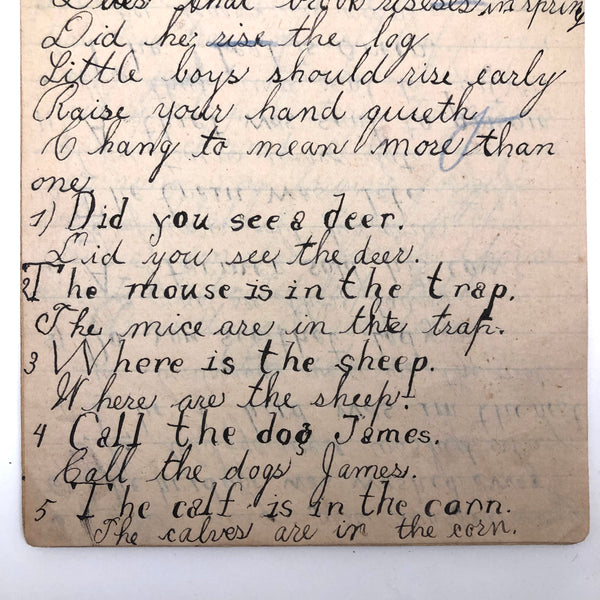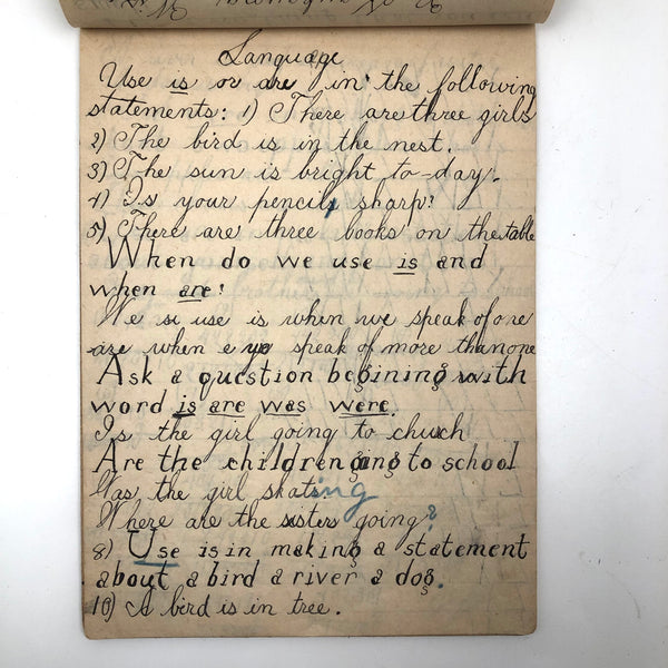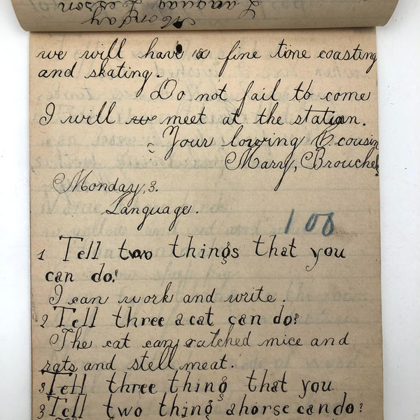 When I come across a school notebook as sweet as this one, completely filled by a young Mary Broucher years and years ago, I simply have no choice but to become its steward. An excellent sort of call and response between questions, written in the best printed lettering, and then answers written in careful cursive--lots of them happily addressing the qualities and habits of a rabbit: from a bunny's "surft" fur to the proper way to pick one up (by the ears) to the conclusion: "it seems cruel to kill such pretty creatures." With great phrases cropping up throughout-- "Little children love each other. Show true love to great and small"; math calculations interspersed with language lessons, and little flowers and flourishes drawn in colored pencil here and there. Dense with joys, and formally the handwriting, particularly the printed lettering of the questions, completely does it for me.