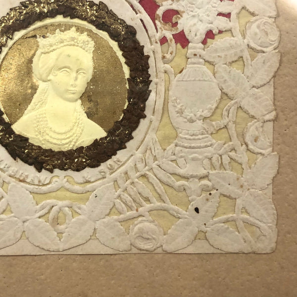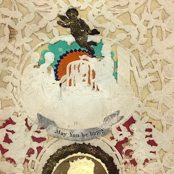 A beautiful example of one of these layered paper lace and embossed die cut valentines, or love tokens, and an early one--c. 1860s-70s I believe. I would guess this one was actually given on the occasion of a birth or christening, with the hopes of a happy life being imparted to the child, and, it looks to me, a babtism occurring at top center--though it also looks a bit like a baby in a bird cage! Detail photos give the best sense of the layering and embossing here.