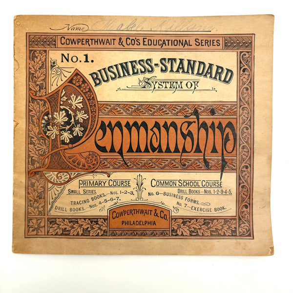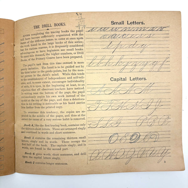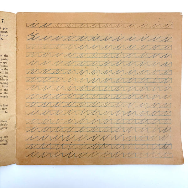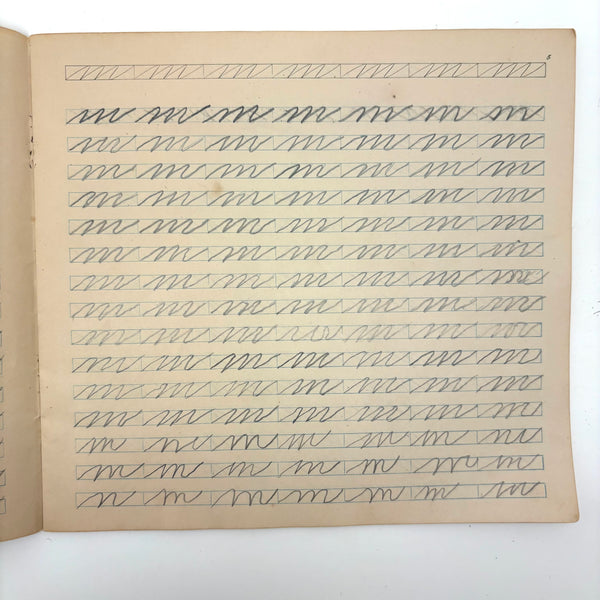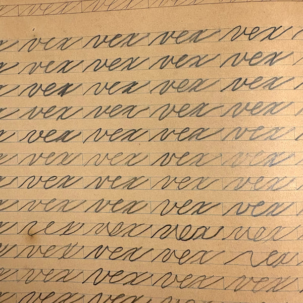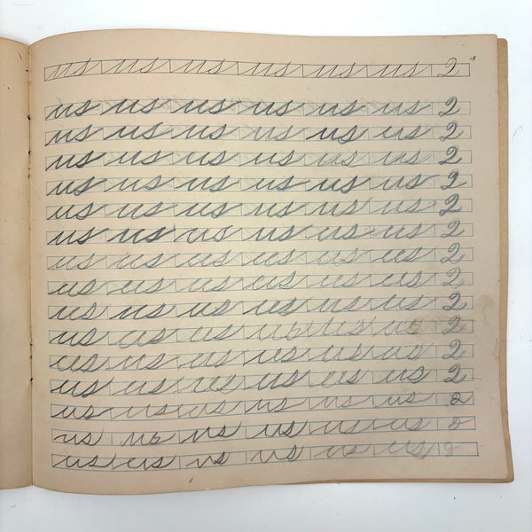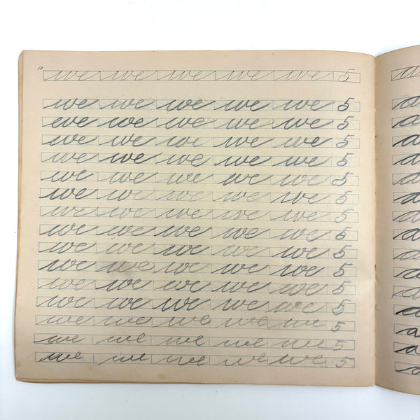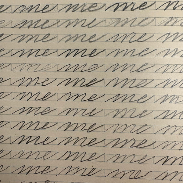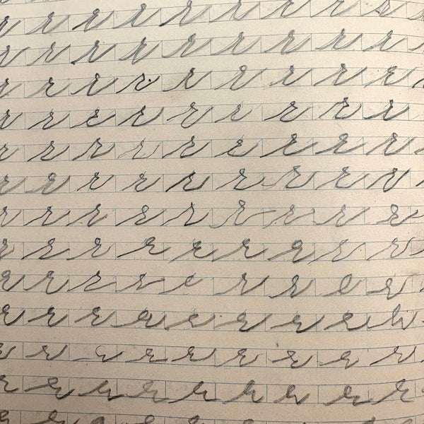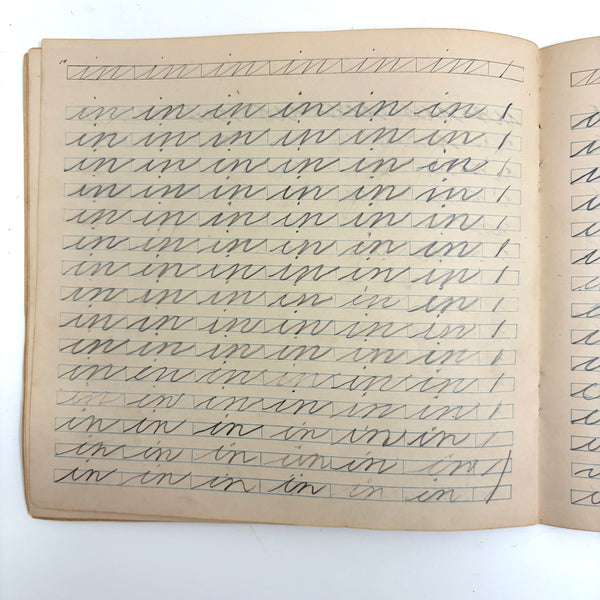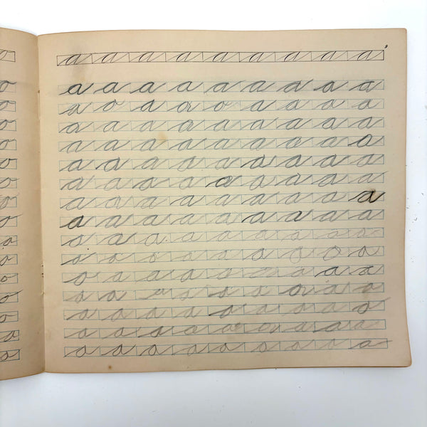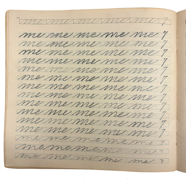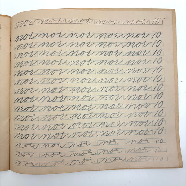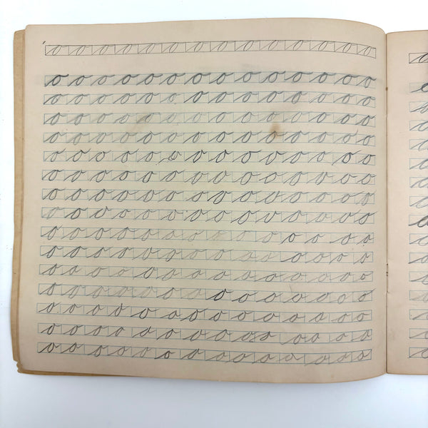 One of two penmanship notebooks today, both found in Rowley, MA, one town over from me. This is the simpler of the two--whole pages of single letters, and then short words: me, on, our, nor, etc. I just love seeing these whole fields of "o"s and "me"s and "ace"'s. Feels both like found poetry and abstract drawings.
