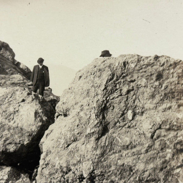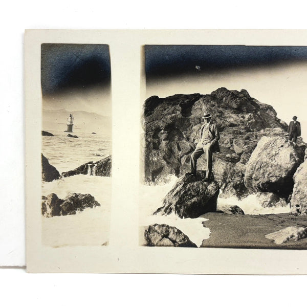 Such an interesting and unusual one--a very cinematic image, reading like a diptych, with vertical line separating the two parts as if to mark a jump between two different cameras, one trained on a near view of the protagonists on the rocks, the other on a distant lighthouse. And what a very very cinematic sort of figure this man in suit and hat standing on the rock in the foreground! (Very Cary Grant.) With a hat perched on the boulder to the right--probably worn by a man standing behind it, but reading as if the remaining trace of an antagonist just thrown to sea! Excellent.