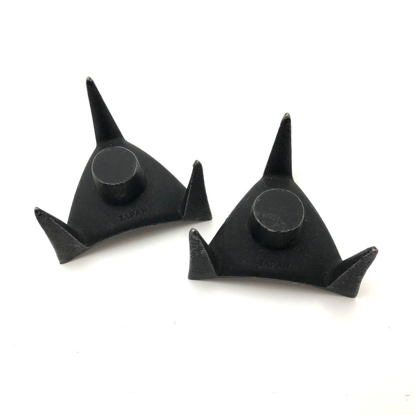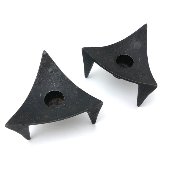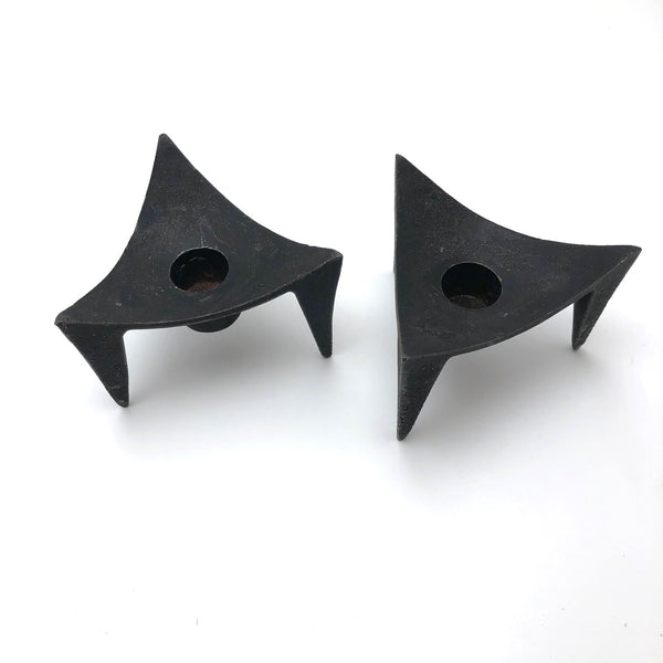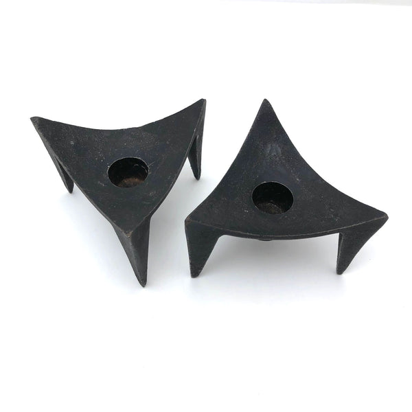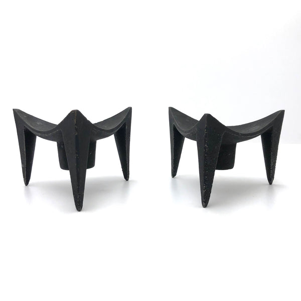 I believe this pair was designed by Jens Quistgaard and produced in Japan for Dansk, but they are only marked Japan on the undersides, so could possibly be "after" his design. In any event, definitely mid-century, cast iron, and in very good used condition, and sized for standard taper candles. Viewed at eye level, with their spindly legs, they also remind me a bit of Louise Bourgeois spiders! Great for all the time use.