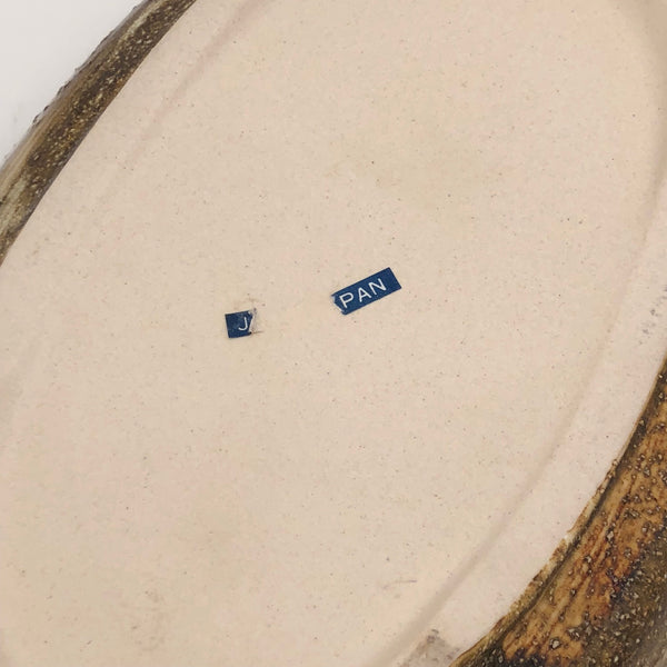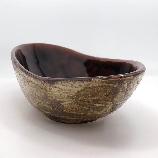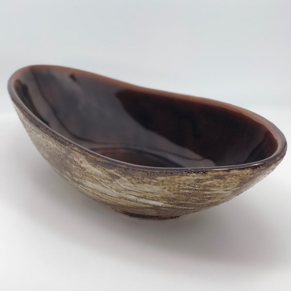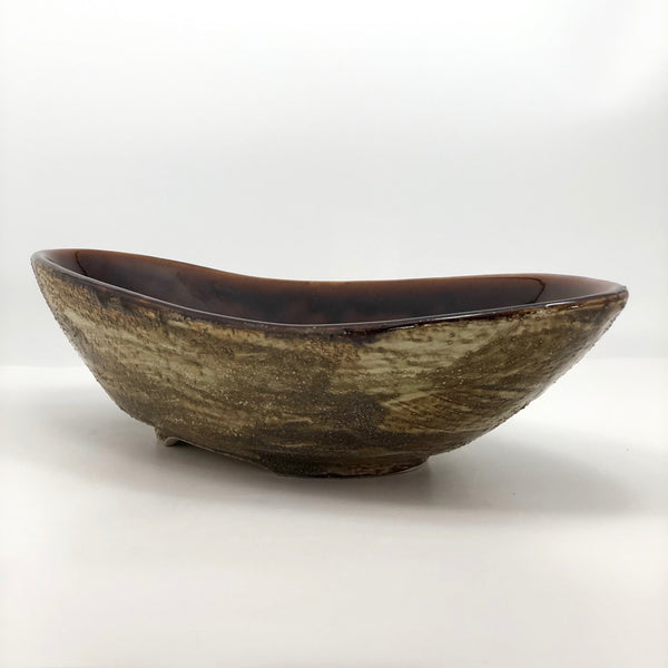 This large, presumed mid-century, boat-shaped Japanese pottery bowl is a study in contrasts, with earthy, almost rocky variegated exterior dramatically contrasting with silky smooth, chocolate-y brown interior glaze. It's especially nice on the table as a serving bowl, but also lovely displayed in silhouette on open shelves. Or use it as a vase for ikebana!