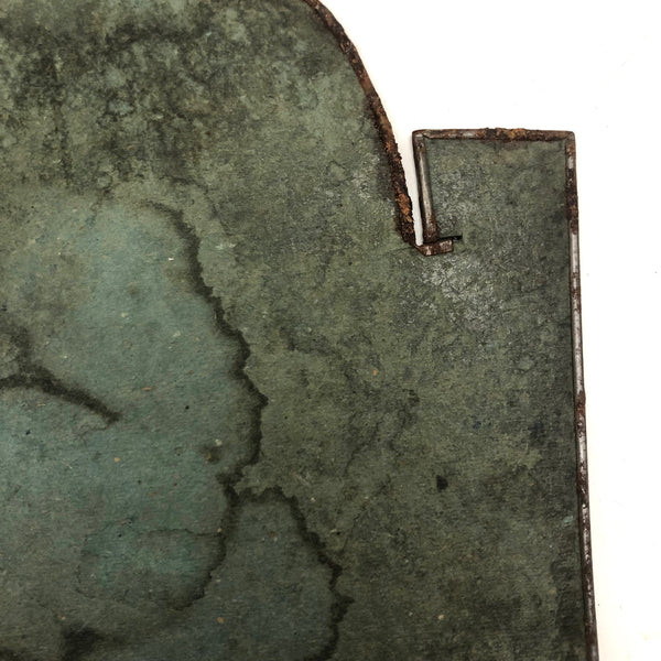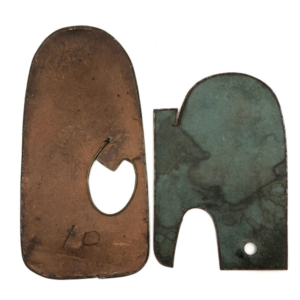 I found a group of six of these old templates this week in Maine—where gloves and mittens are certainly a necessity for a good chunk of the year!—and find them so beautiful. It seems only right that I should offer a mis-matched pair among them, as it seems more often than not what's in my mitten drawer! And I really love the odd green one. Nice weight smooth board, great patina, water stains on the green one that make me love it even more, and wire edging that shows a little rust, all to the good. I especially love the shapes of the wire-trimmed cutouts for the finger holes, making them look rather like painters palettes. Super graphic and to my eye really gorgeous.