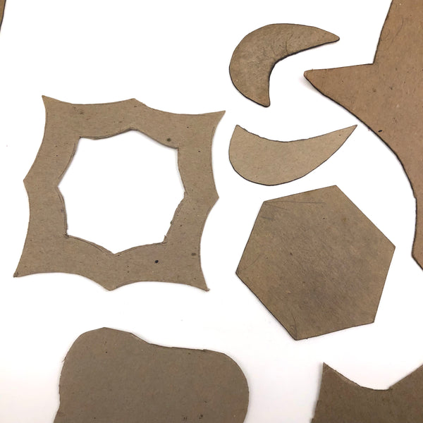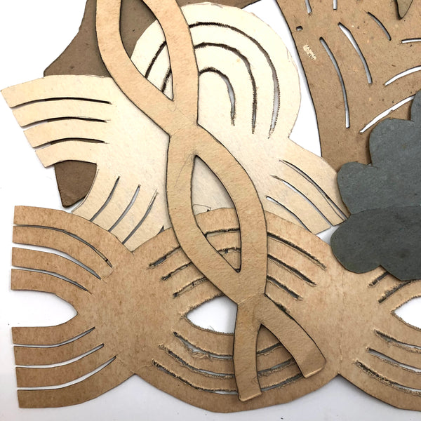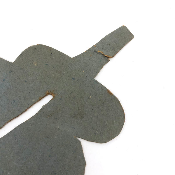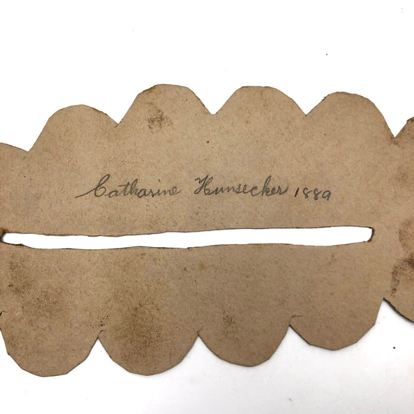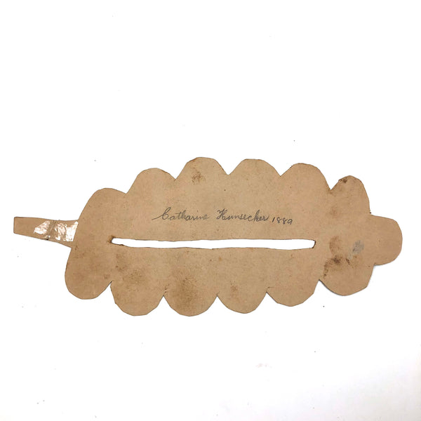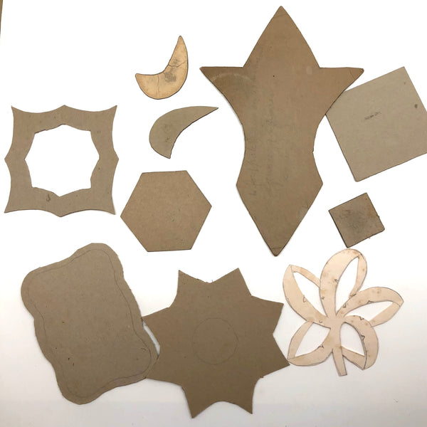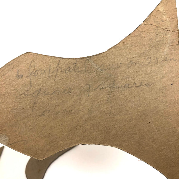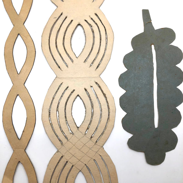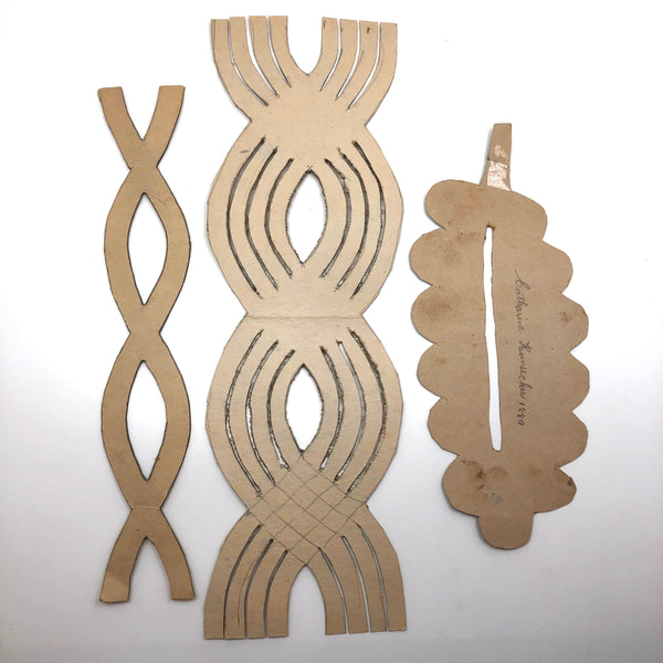 Found in Maine, these are old hand-cut cardboard stencils or templates, which would have been used for cutting pieces of fabric to be incorporated into quilts. The lovely blue leaf shape, signed on reverse (Catharine Hunsecker) and dated 1889, is clearly the oldest among them, more aged and worn than the others. I think the longest chain-like one is particularly satisfying, too.
