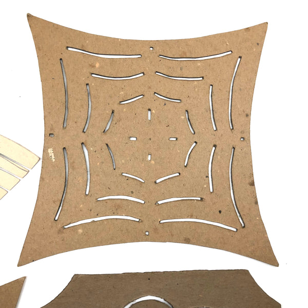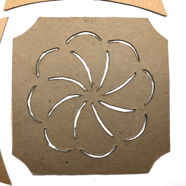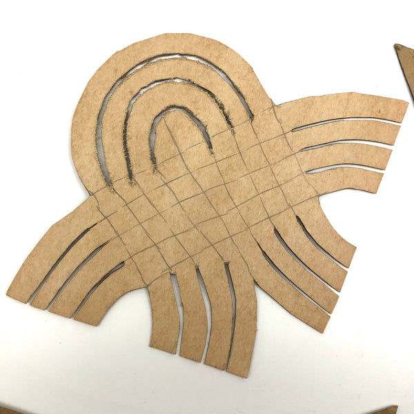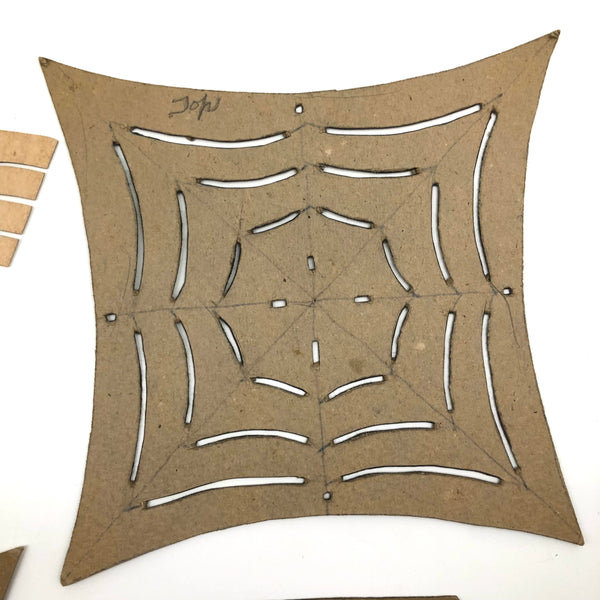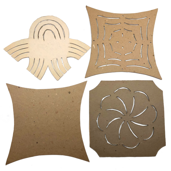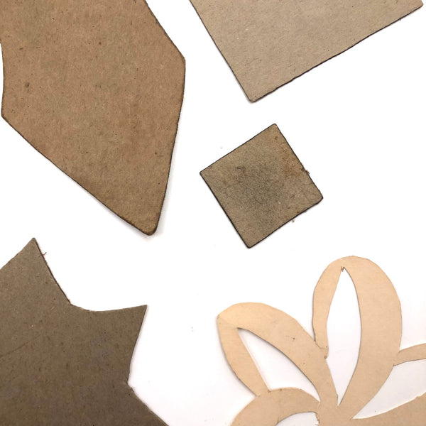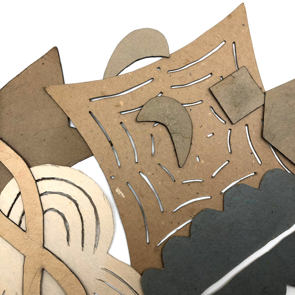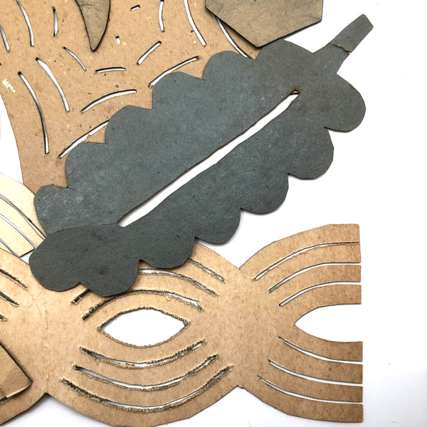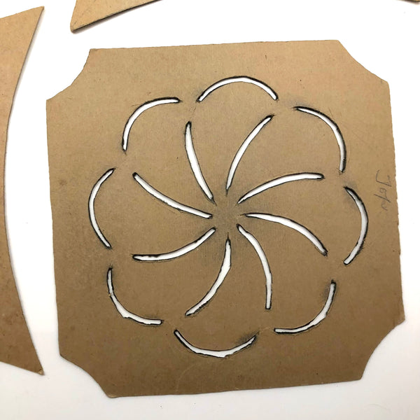 Found in Maine, these are old hand-cut cardboard stencils or templates, which would have been used for cutting pieces of fabric to be incorporated into quilts. The lovely blue leaf shape, signed on reverse (Catharine Hunsecker) and dated 1889, is clearly the oldest among them, more aged and worn than the others. I think the longest chain-like one is particularly satisfying, too.