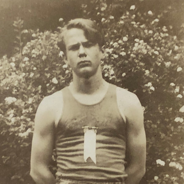 I just love this young man, looking awkward and a bit unhappy, but I think that frown veiling the fact that he actually felt quite proud of the ribbon pinned to his chest! With those muscular legs, I take him for a runner--and this photo makes me think of the loneliness of a long distance one! Feels like he wants company.