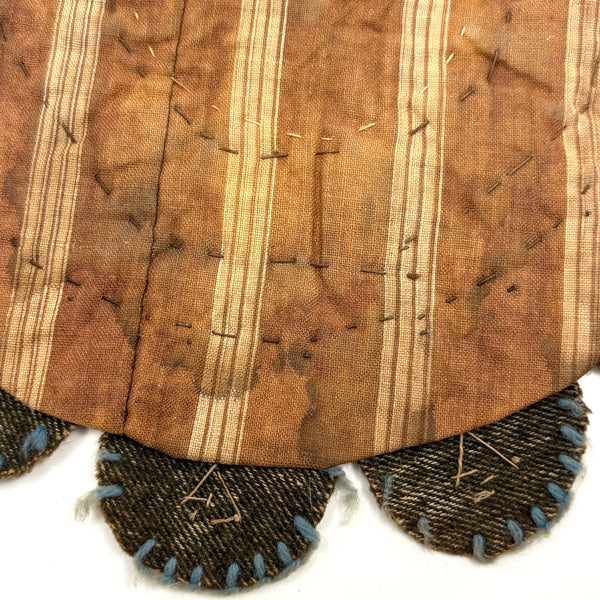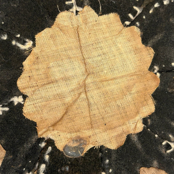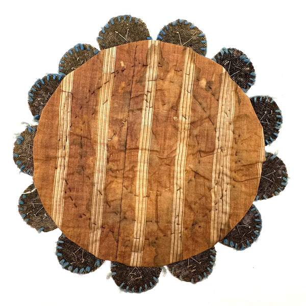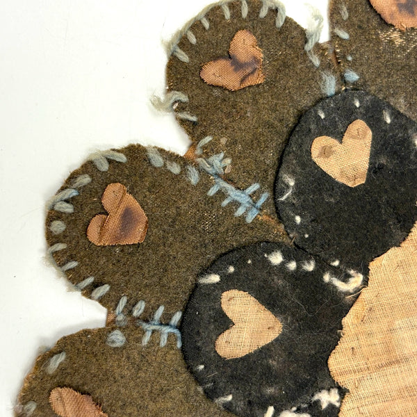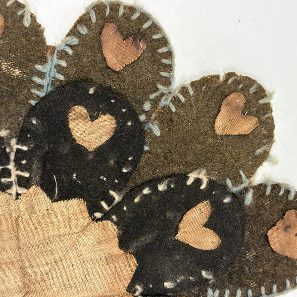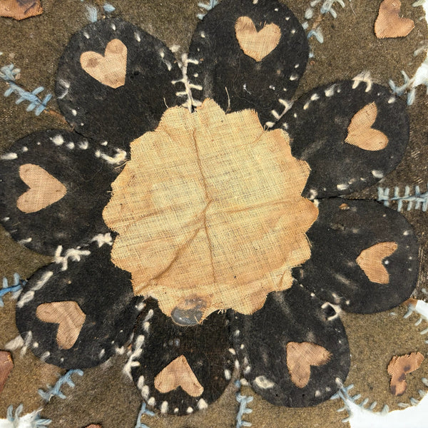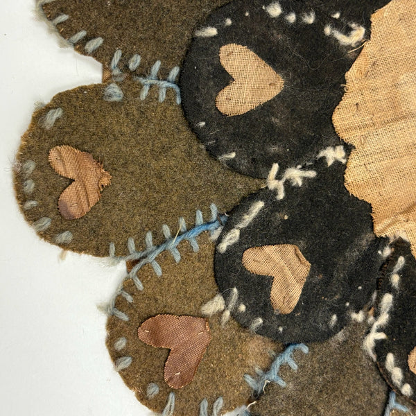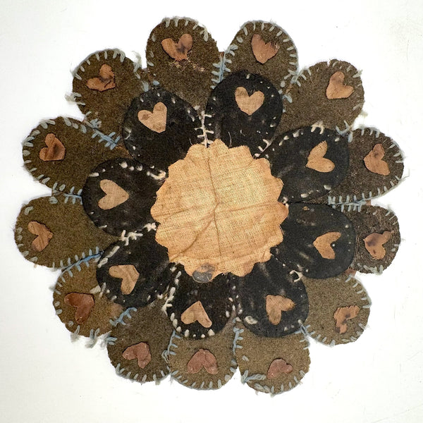 I purchased this one at an antiques show in Maine from a dealer who had had it in her personal collection for many years, brining it out for the first time, I think just for me! It came as no surprise to me to learn that her field of greatest focus and expertise has been early pen wipes; if there were ever a candle mat that felt very close kin to a precious early pen wipe, I think this would be it. And if there were ever a thing constructed in the manner of a penny rug that I was 100% aligned with my sensibilities, this would be it, too--a love token/penny rug/candle mat/very tender handmade valentine all at once. And the reverse side is wonderful too. Total LOVE.
