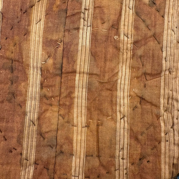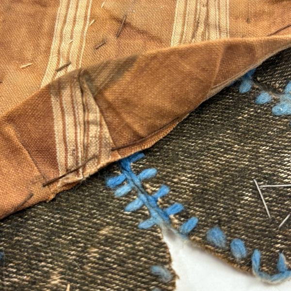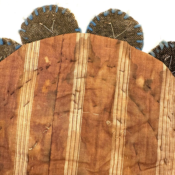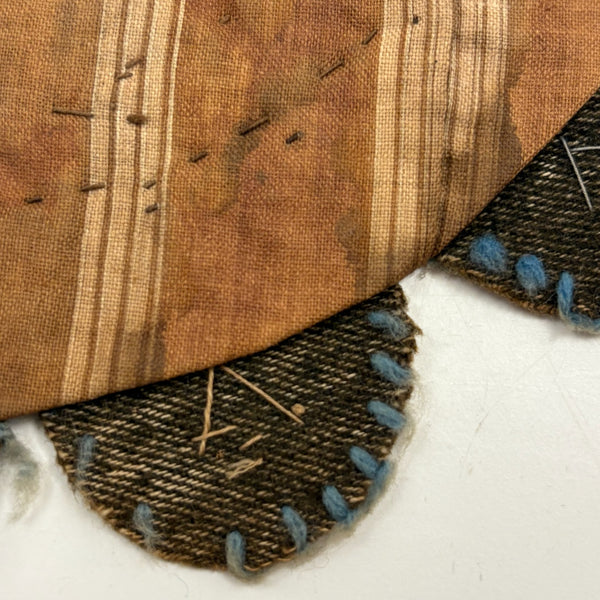 9" x 9". Wool and hand-dyed cotton/linen with what I believe is homespun linen on reverse, wool yarn and cotton thread stitching. Some lost decorative perimeter yarn  stitches as evident, feeling very much all of a piece with it and making it feel all the more tender to me. Quite good structural condition, sound and stable, no fraying, and not especially fragile though one wants to take a little care with it.