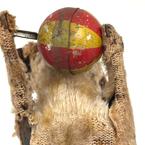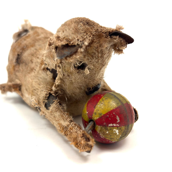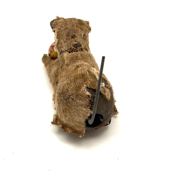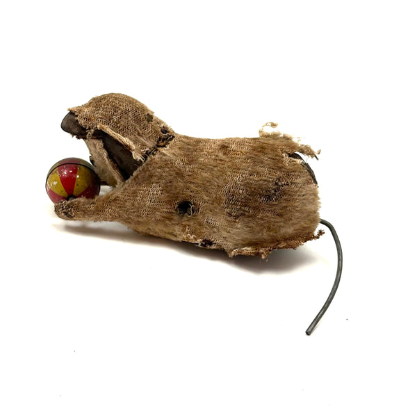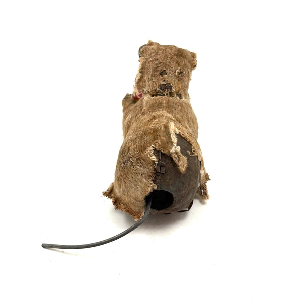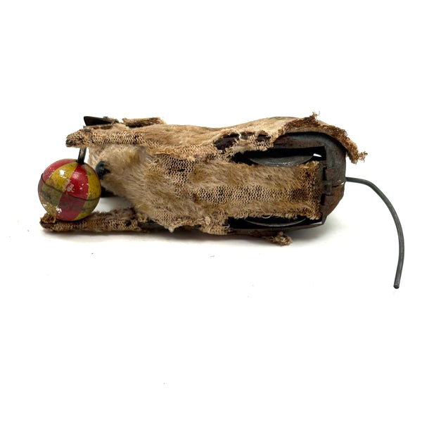 How to resist? I could easily leave behind a mechanical kitty like this in perfect condition, but the wear on this one makes it another thing entirely-- a hugely empathetic creature! I believe it once wound up with a key and would roll along mechanically, but now it just sits--all the better to snuggle with, I'd say! A charmer. And it's metal wire tail does flip back and forth or stand straight up. C. 1940s I believe, likely made in Japan.
