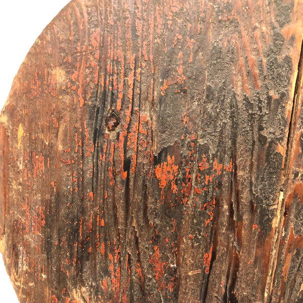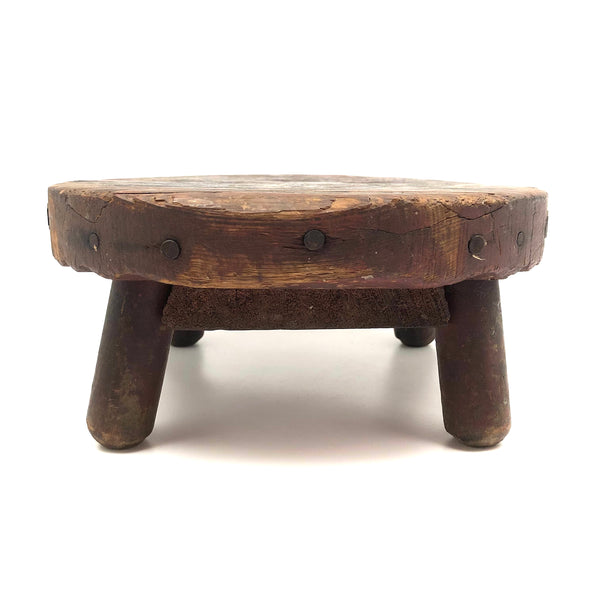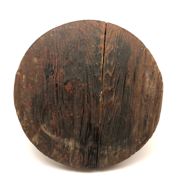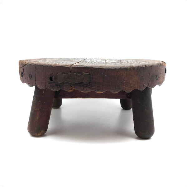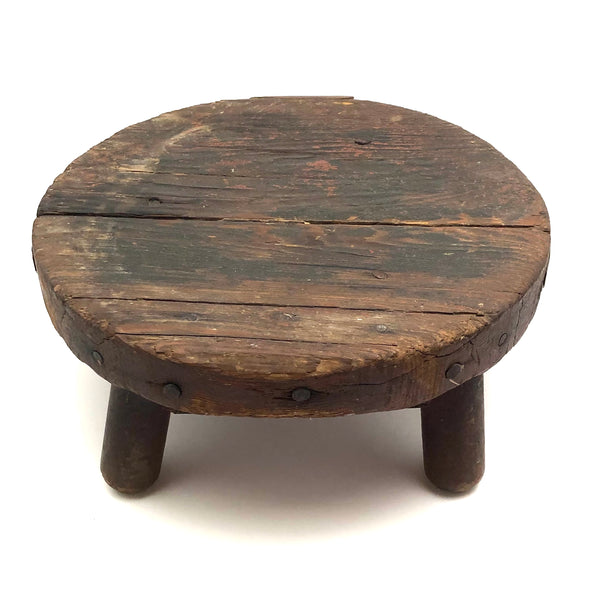 To me eye quite a charmer of an old primitive stool--I guess I'd call a foot stool, though it could very well have been used for milking. Definitely it was much used, and much valued, with metal plates mending an old split from either side, and an extra piece of wood reinforcing it from below, cut at the corners to accommodate the legs. And with a ribbed texture to the underside of the top, lending the stool a scalloped edge on two sides. With a little old red paint holding on to the surface, and much more visible underneath. Great as a pedestal, or just its own thing.