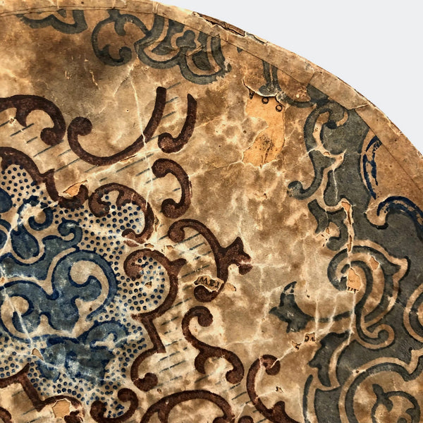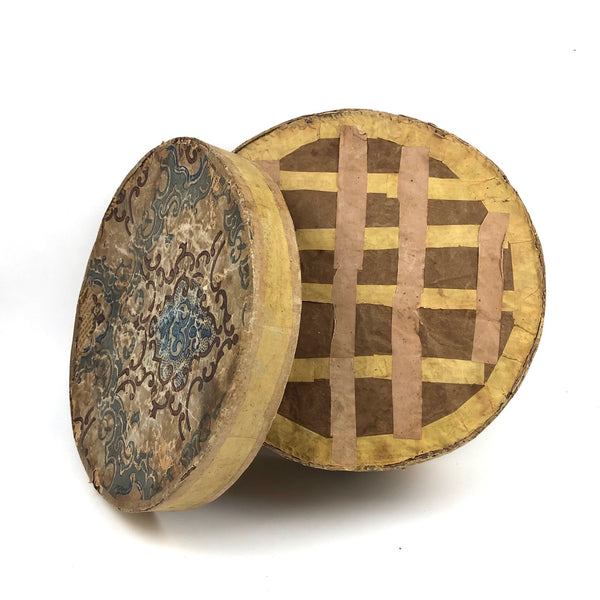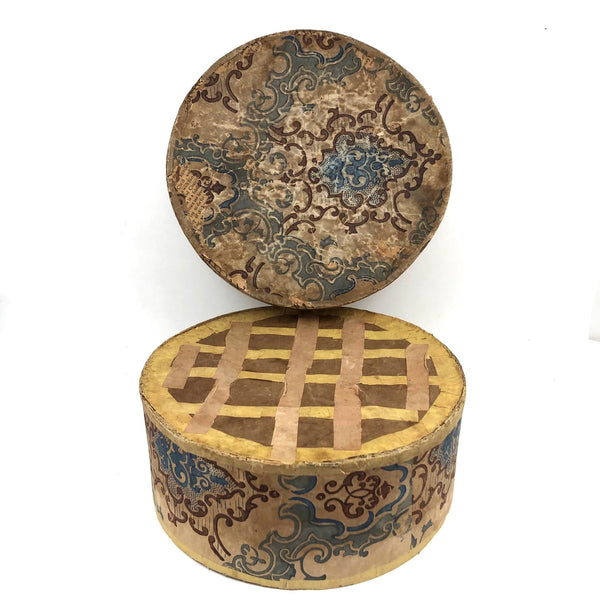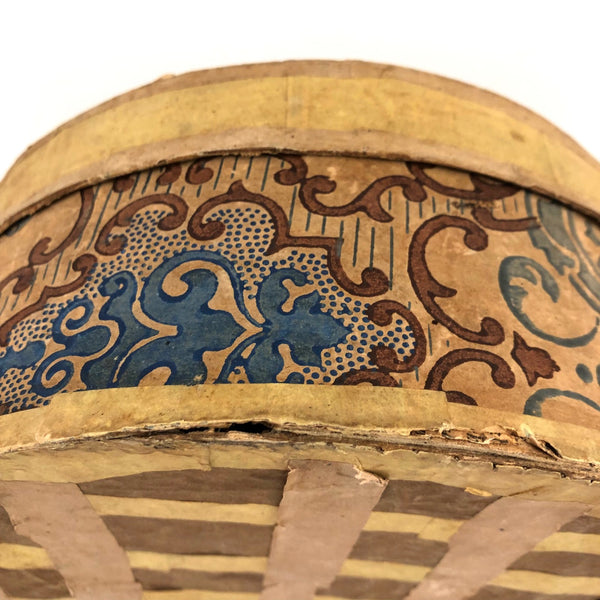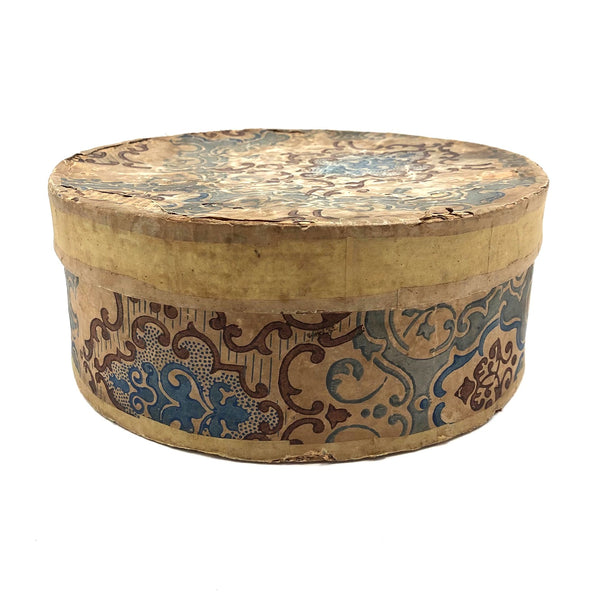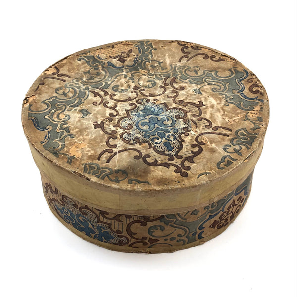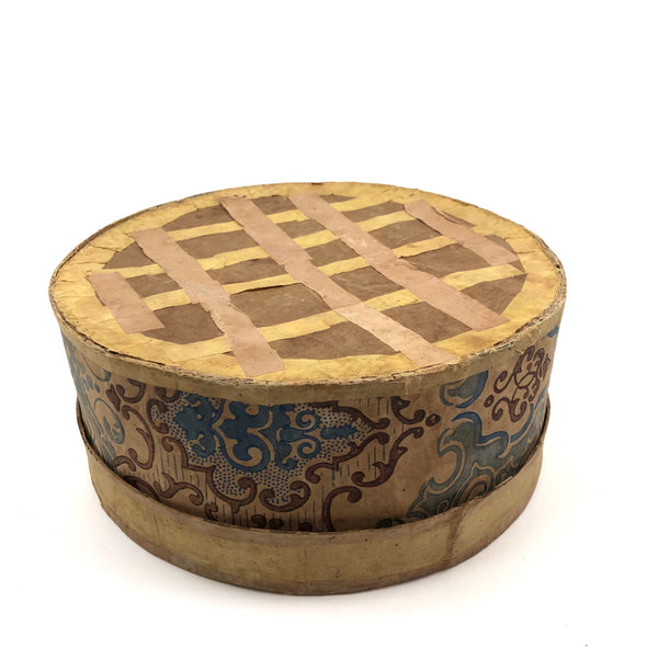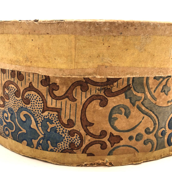 9 1/16 x 3 3/4 and in very good antique condition--structurally in great shape, no losses, just light general wear and fairly minor paper losses to the exterior of the lid.