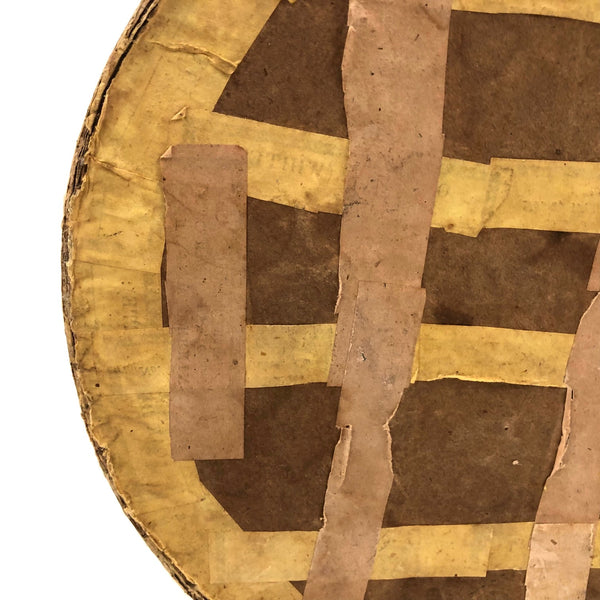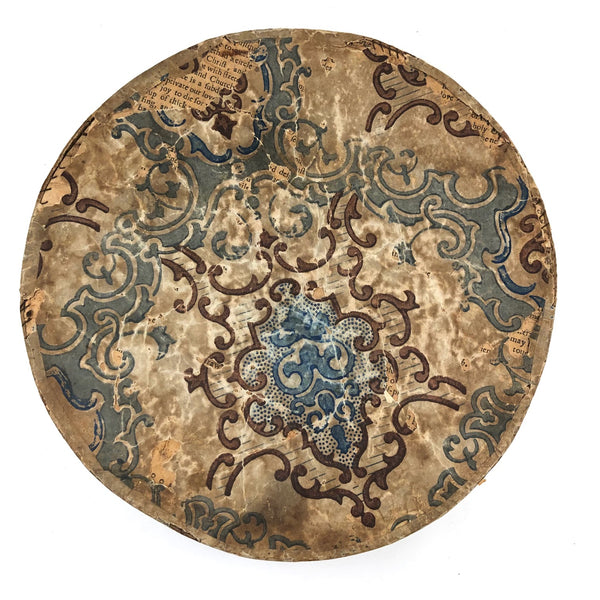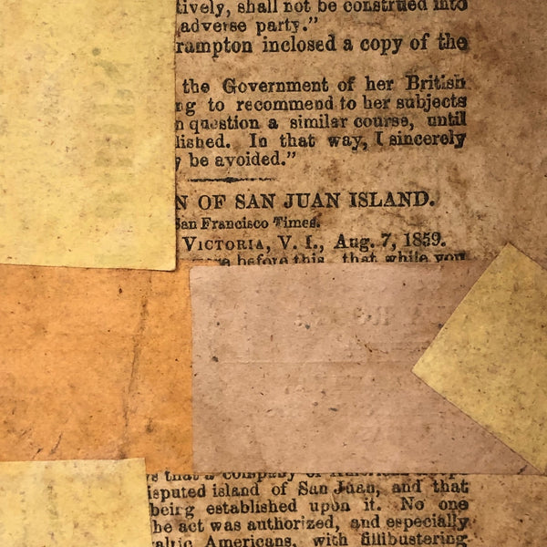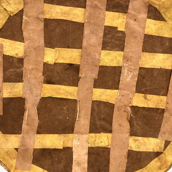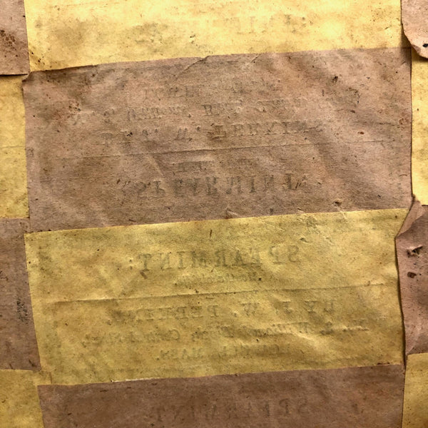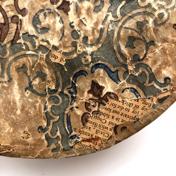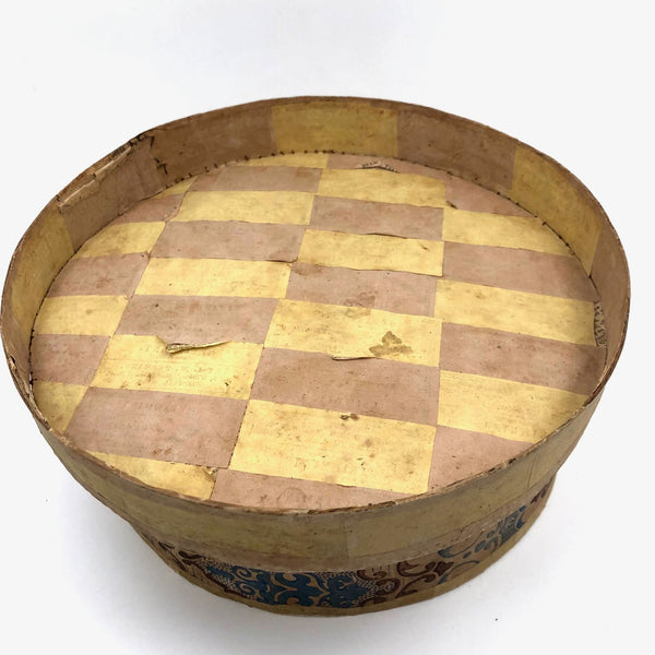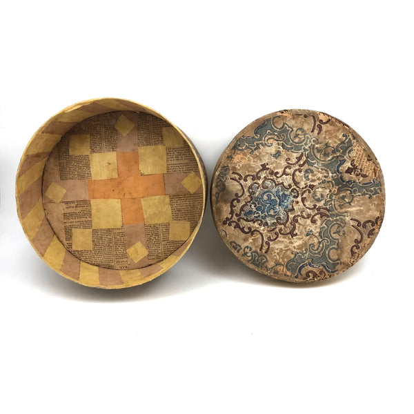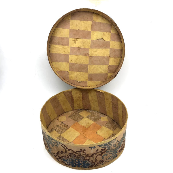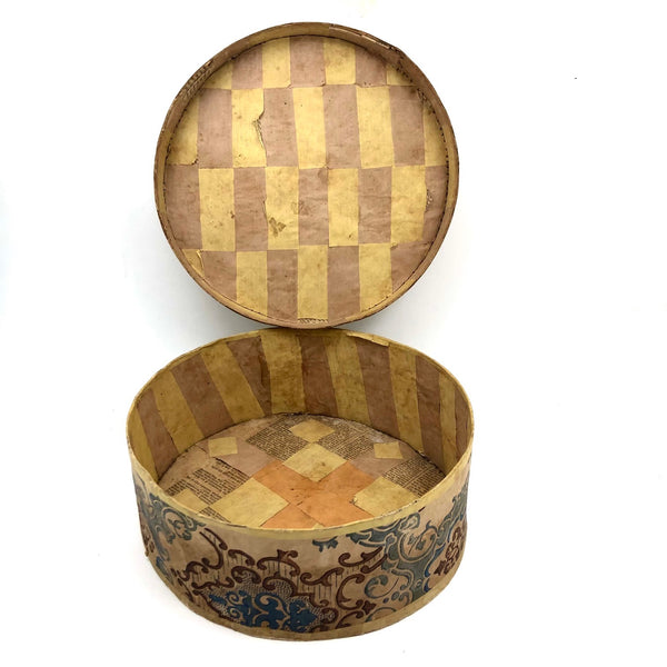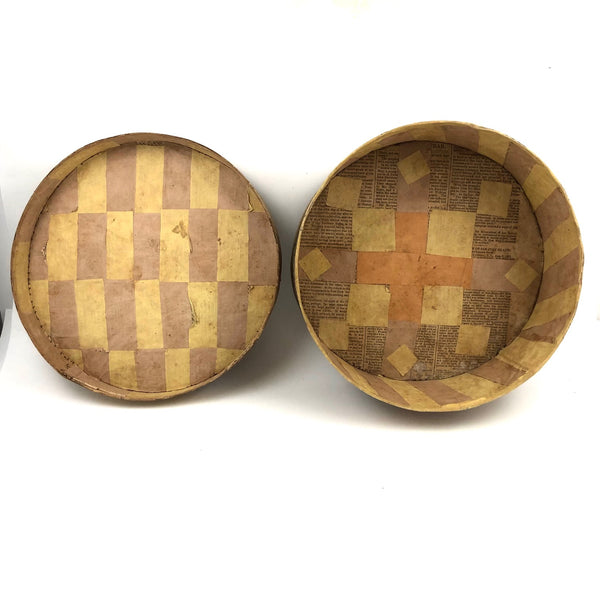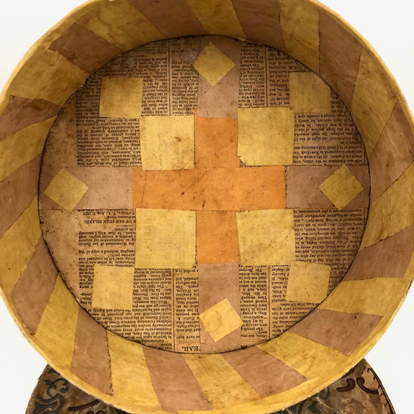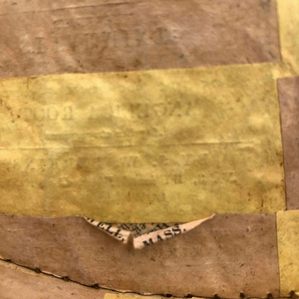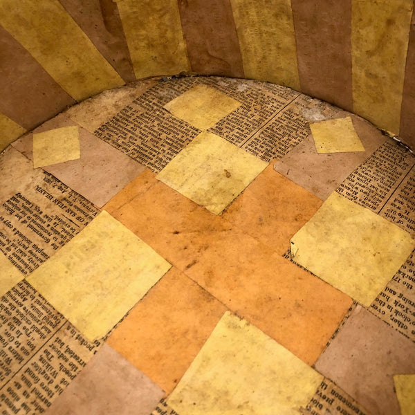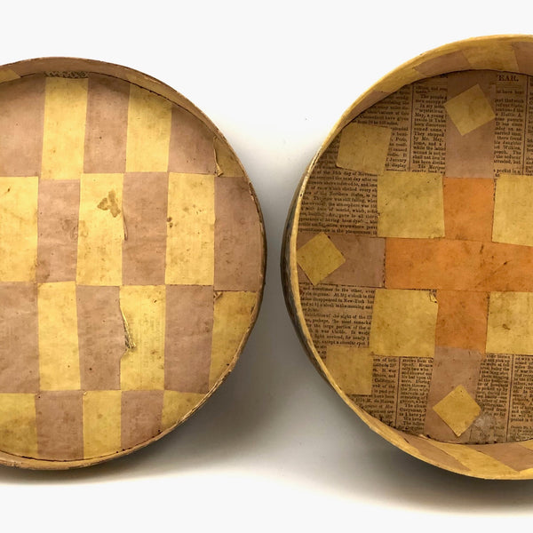 Pure joy to find this one in Mid-coast Maine this week, a 1859 wallpapered "band" box with very lovely exterior, but completely wonderful and surprising interior and underside! I can't look those pink and yellow papered grids and stripes without thinking of Froebel kindergarten cut and woven paper works, which it would have pre-dated a bit in the U.S., and also of course of quilts, and of 20th century modern abstract painting...just glorious. And it was certainly an inventive and resourceful woman who made this one, using printed scraps to make those patterns (they are clearly printed on the flip side) and layered them over newspaper of the day, as is often the case with these, but here using the grids of the printed columns as another design element. Every inch of the box attended to, with one delight after another revealing itself. There is a 1859 date to the newspaper, which mentions New York and Connecticut, and one little scrap on the interior revealing "Lowell, MA."