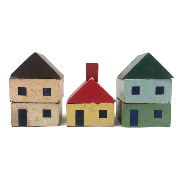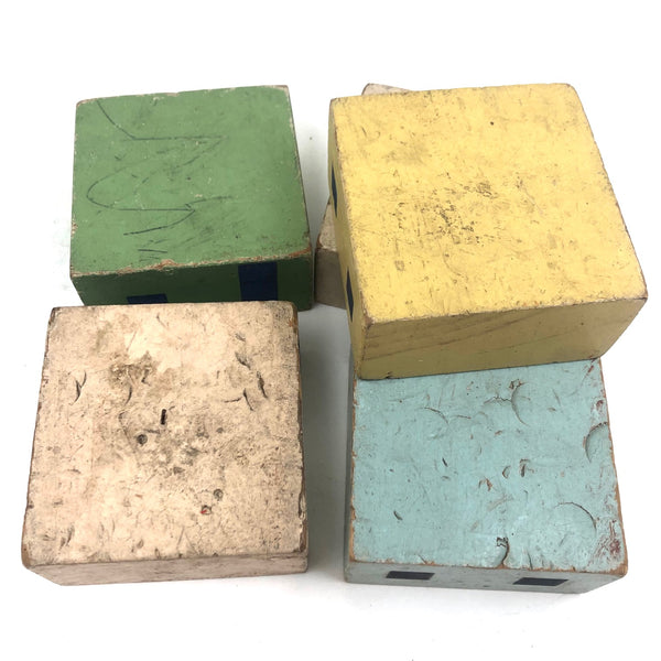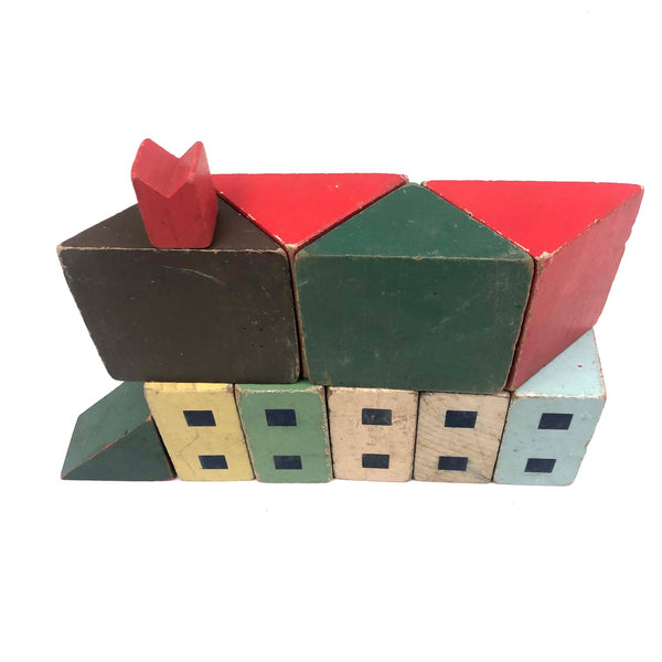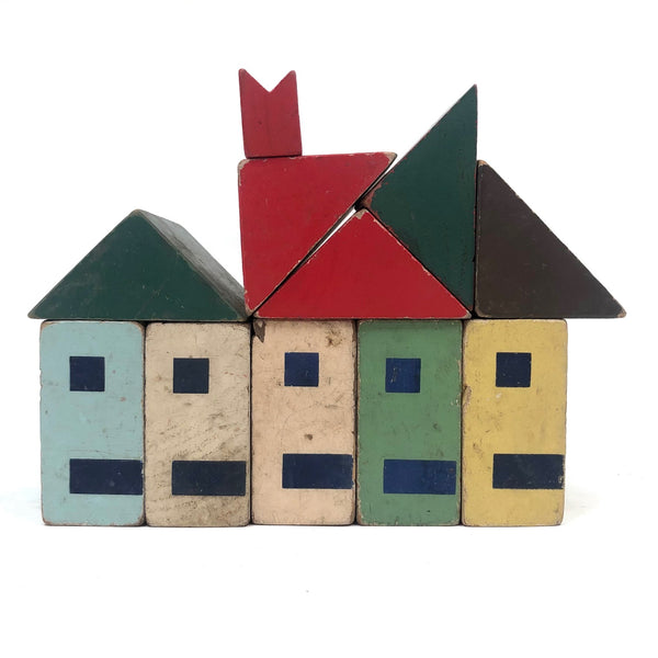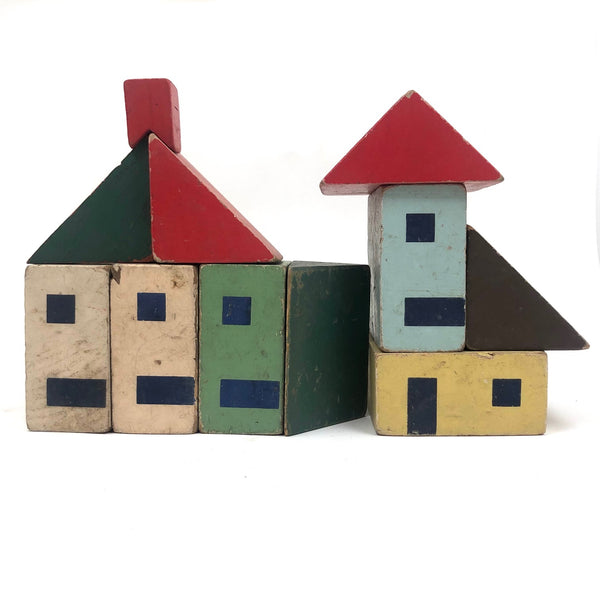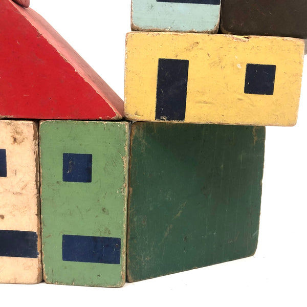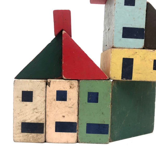 I've never seen another set of blocks quite like these, and they are my new favorites ever! (Of course I would love to have a huge lot of them, but there's also something just right about what's here, which I found in an old cardboard box at an antiques shop in Freeport, Maine. I find the colors exactly perfect, the proportions exactly right, and one each of the rectangular blocks are two square windows on one side and a window and a door on the other, allowing for building double and triple deckers--and they look to me like faces when turned on their sides. Of a nice substantial scale, with excellent aging to the paint. LOVE.