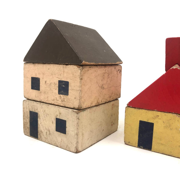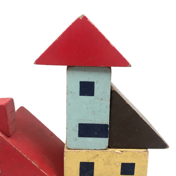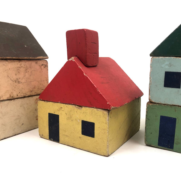 Rectangular blocks with windows: 3 1/4” x 3 1/4” x 1 5/8” ea. Set includes all pictured, including one little red chimney. 1940s maybe?