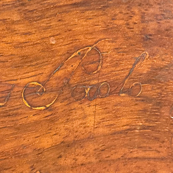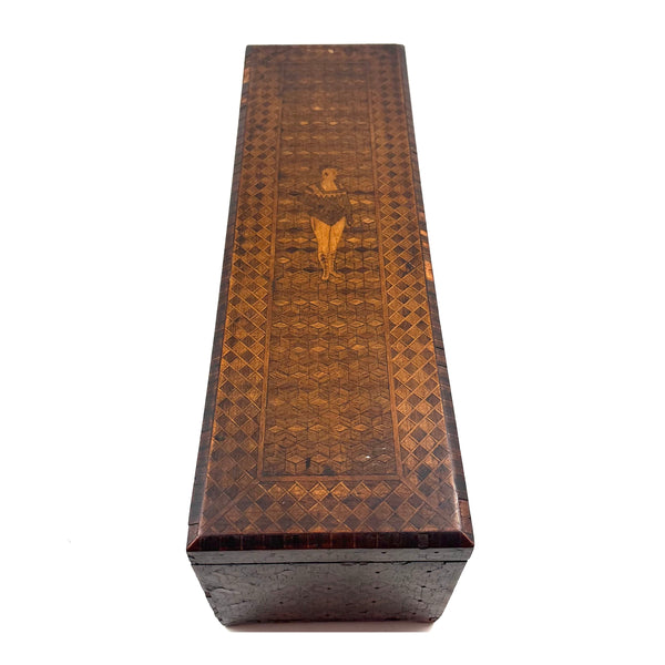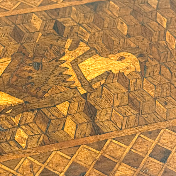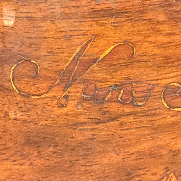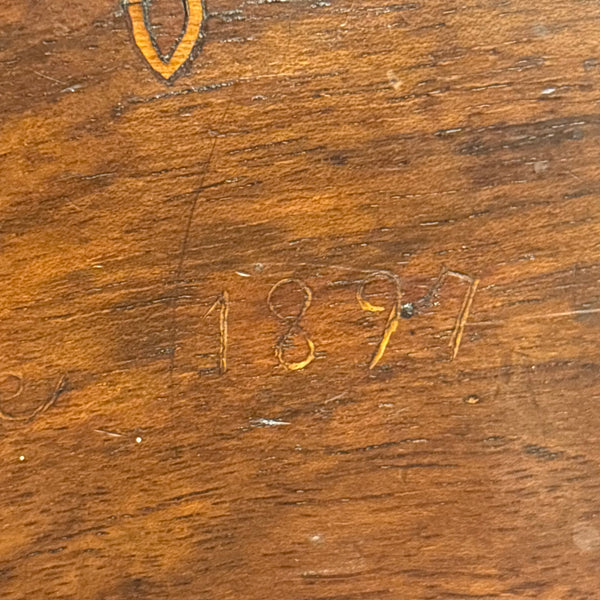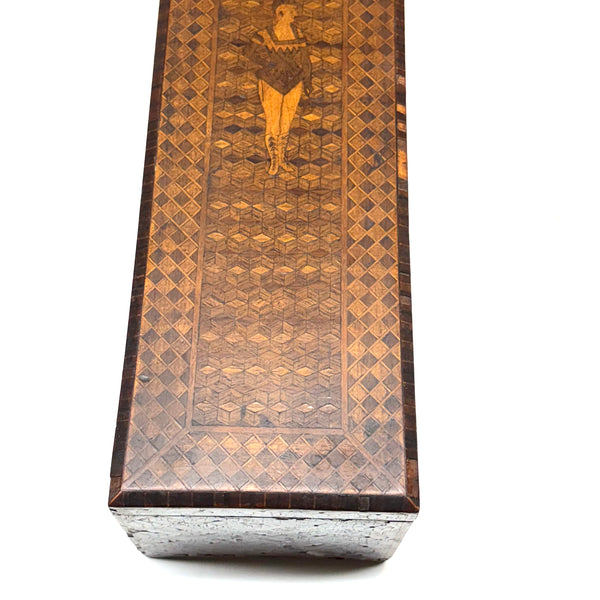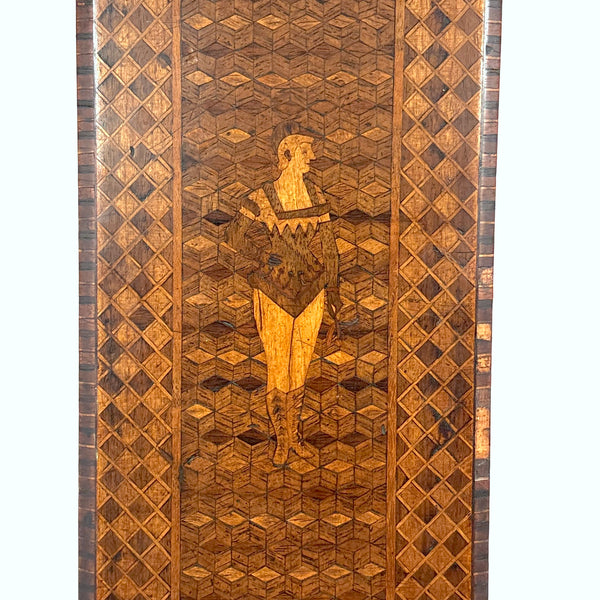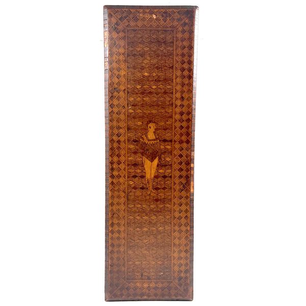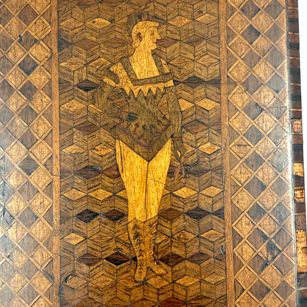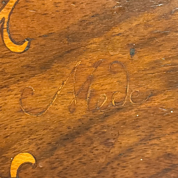 How fabulous is she??? I take her for a burlesque performer in this very excellent outfit, complete with high boots and helmet-like hat, and it seems just right that she be dangling what looks to me like a couple of cherries from her lowered hand. I take the box for a glove box, just long enough to house the very gloves she has on. What makes this especially special to me is that it is inscribed, via inlay, on the exterior rear side (and dated 1897)--my guess, though I don't know for sure, is that it was made as a gift to the maker's favorite burlesque star! Italian I believe, and and I believe this sort of marquetry would be called intarsia. And what an extraordinary lot of work, each of these tiny bits of wood laid down one by one. There are a few losses here and there, mostly along the edges, as documented, but what a marvelous and special feeling thing. The rear, signed side looks to me to read Nani Pocolo (and then one more word I can't quite discern, probably a last name), Made 1897.