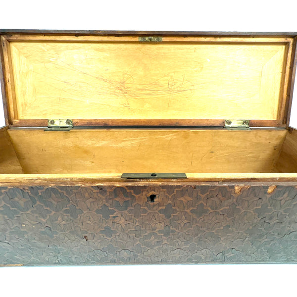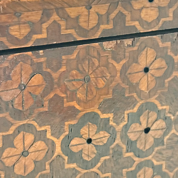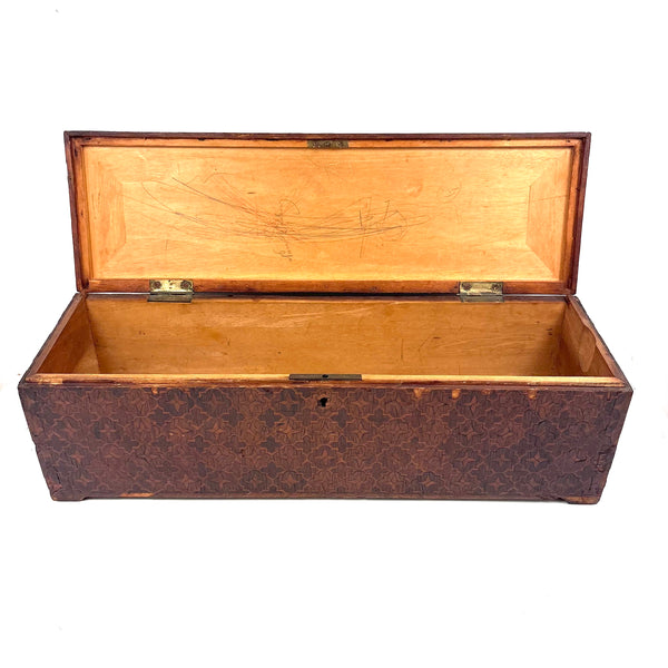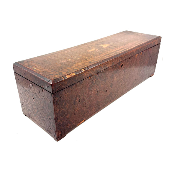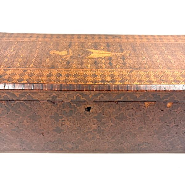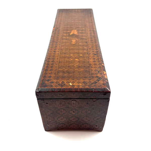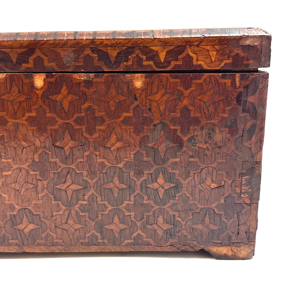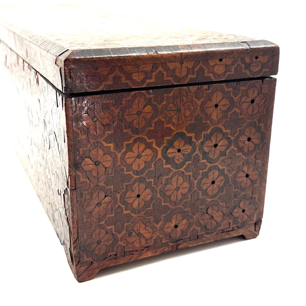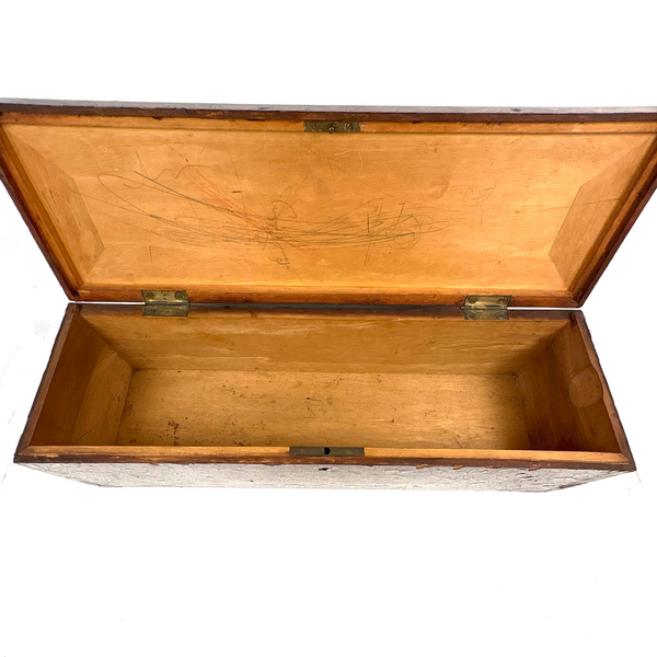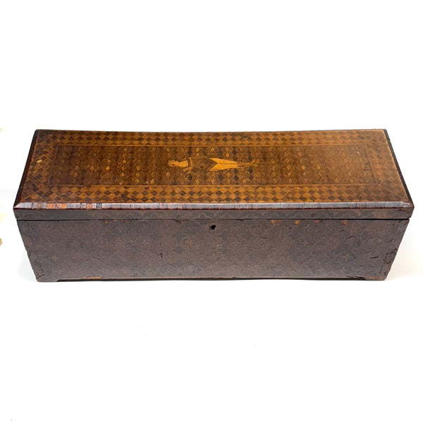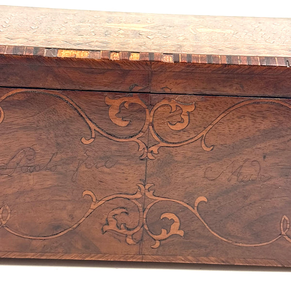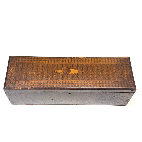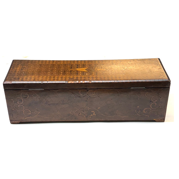 16 1/4" l x 5 1/16" w x 5 1/8" t. Good overall condition, sound and stable. Some losses to the inlay as documented, mostly along edges. Hinges in good shape, lid closes flush.