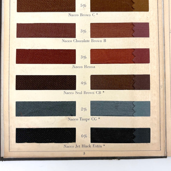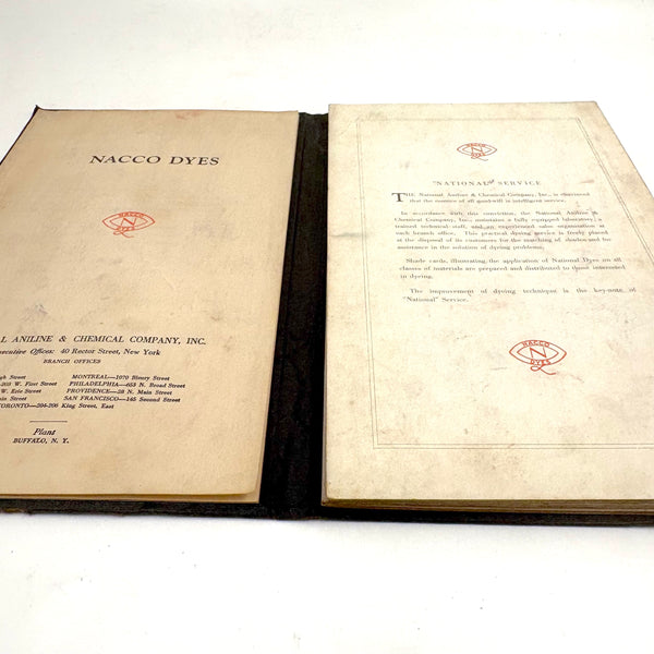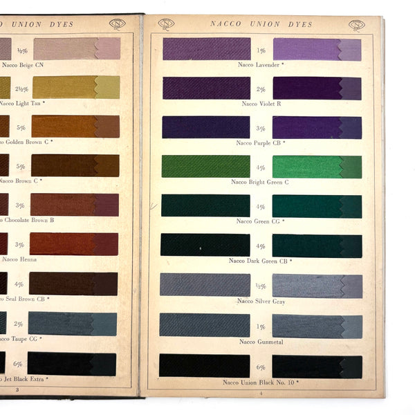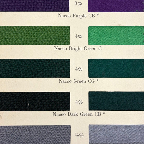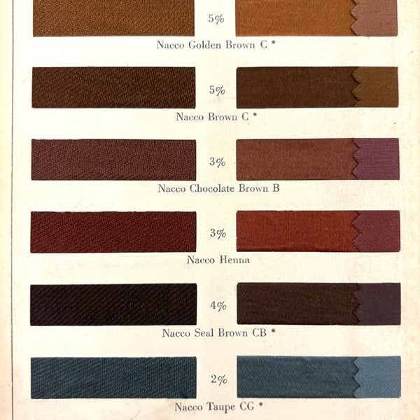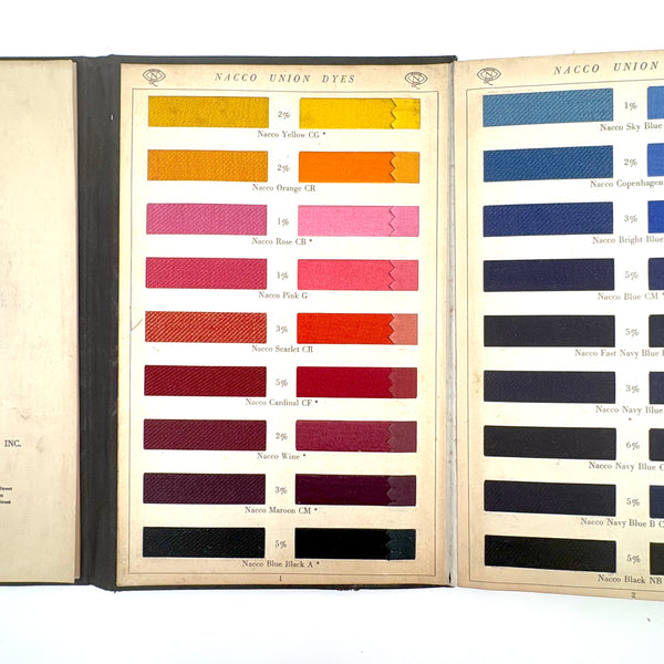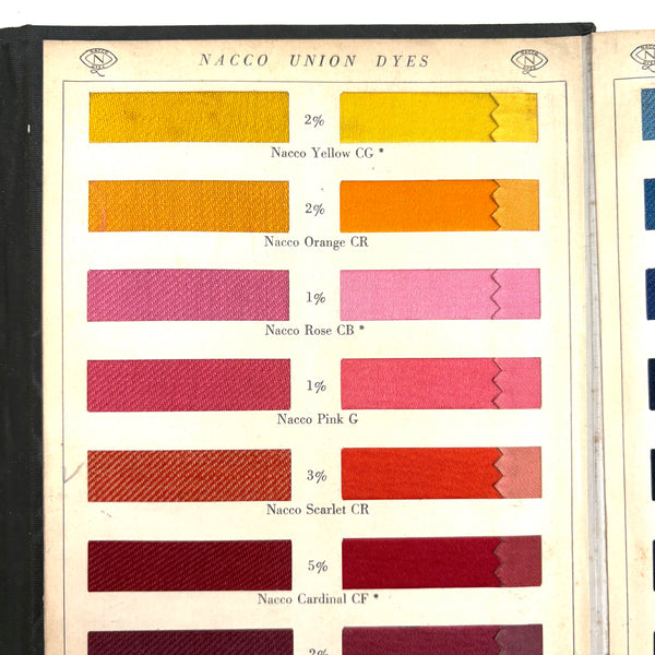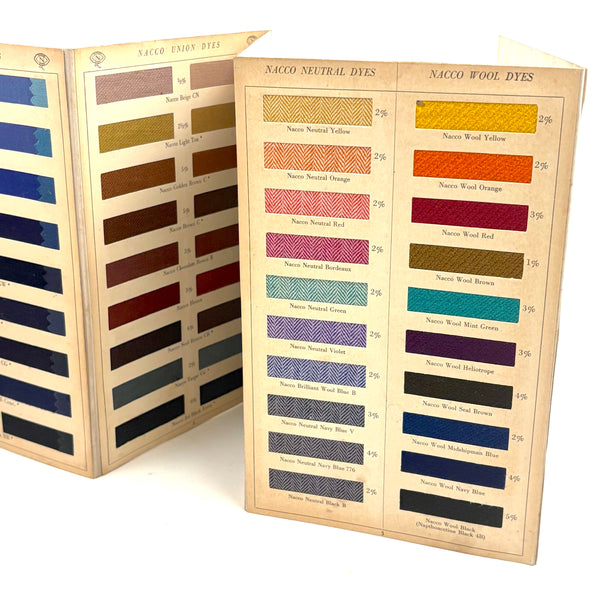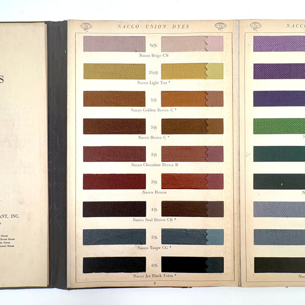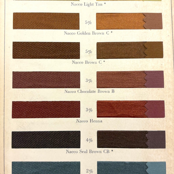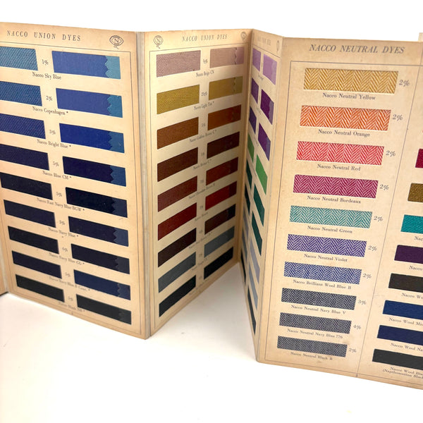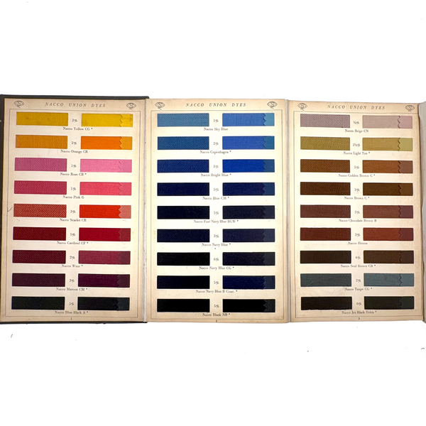 More total gorgeousness--this the second of two antique dye color samplers listed today, both I think about as good as it gets. I seem to have an insatiable want for color these days, and these feel like pure sustenance to me. This one, for Nacco Dyes, was produced by the National Aniline & Chemical Co., c. 1910s-20s and features 90 color samples, applied to a mix of silks, wools, and cottons, thus feeling like a textile sampler as well as a color one. Accordian fold, heavy card, with a sort of sateen fabric cover. Photos give some sense but very much more beautiful in hand.