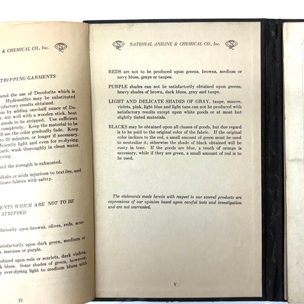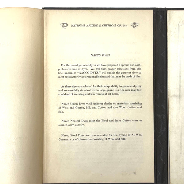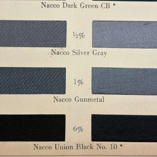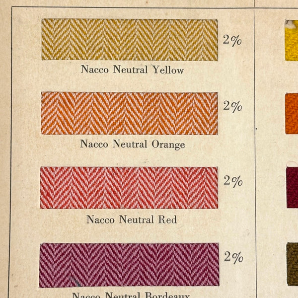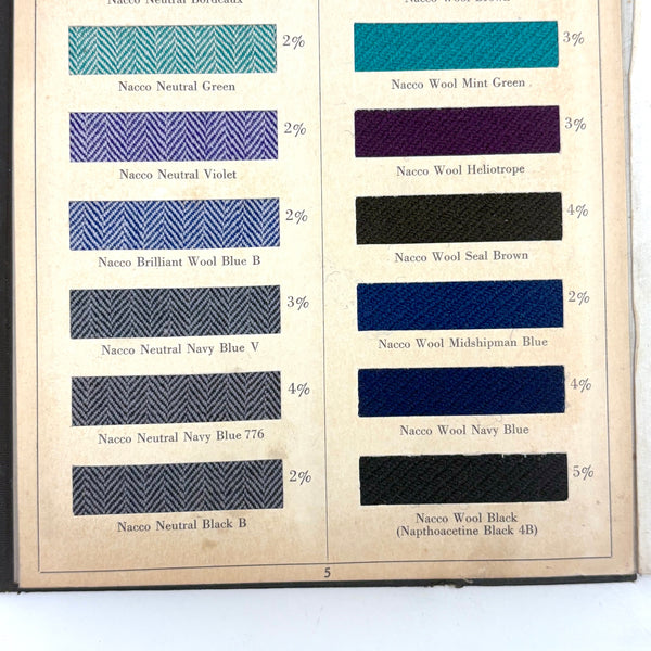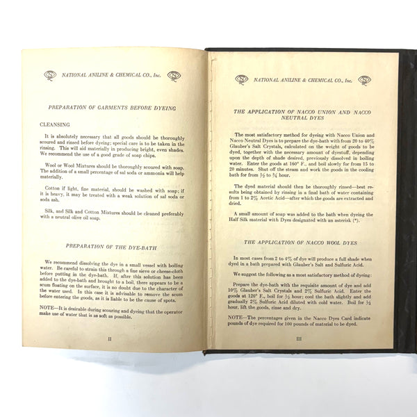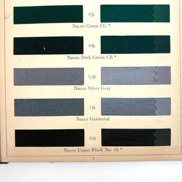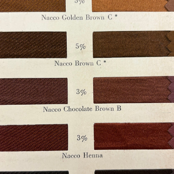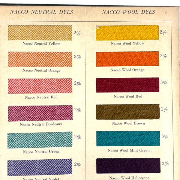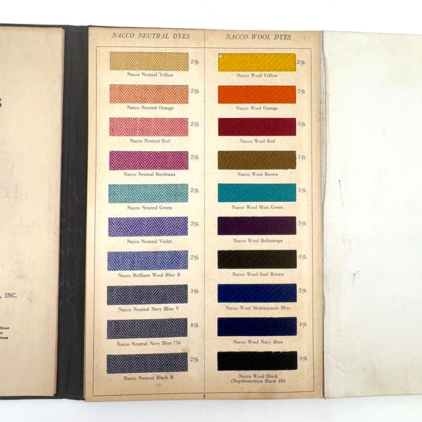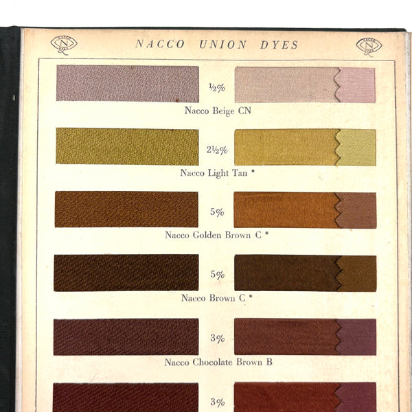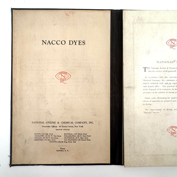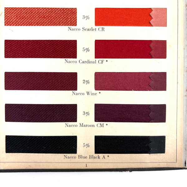 More total gorgeousness--this the second of two antique dye color samplers listed today, both I think about as good as it gets. I seem to have an insatiable want for color these days, and these feel like pure sustenance to me. This one, for Nacco Dyes, was produced by the National Aniline & Chemical Co., c. 1910s-20s and features 90 color samples, applied to a mix of silks, wools, and cottons, thus feeling like a textile sampler as well as a color one. Accordian fold, heavy card, with a sort of sateen fabric cover. Photos give some sense but very much more beautiful in hand.